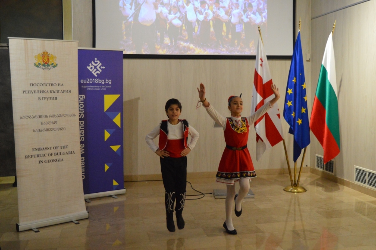 Танцов поздрав за гостите на проявата поднесоха облечени в български носии малки танцьори от грузинския ансамбъл „Нартеби“, които специално за случая бяха разучили няколко български народни танца.