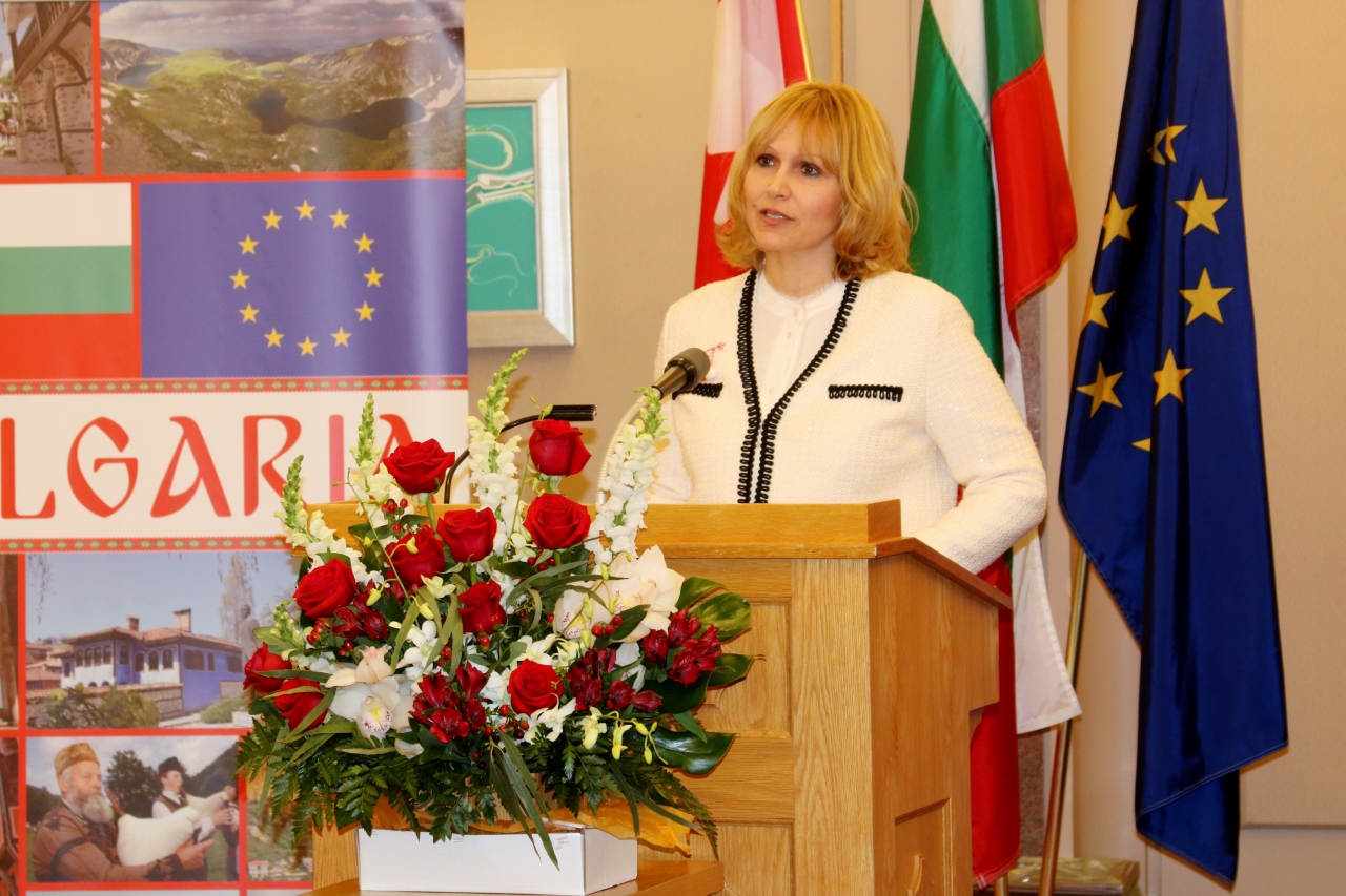 Временно управляващият посолството в Отава Светлана Стойчева-Етрополски благодари за изключително ползотворното сътрудничество и партньорство на Групата за приятелство и лично на сенатор Йона Мартин за създаването на успешни платформи за обмяна на идеи, контакти и опит. Тя се спря на целта на посолството да разширява присъствието на българската култура в Канада и отчете огромната роля на българската общност в страната за постигането на тази цел. Дипломатът отбеляза Националния празник на България Трети март като един от символите на българската национална идентичност, самочувствие и достойнство и пожела на присъстващите наши сънародници да продължават да изграждат живия мост между България и Канада. “В Канада посрещаме този ден сред приятели, с които споделяме едни и същи цели и ценности“, заяви тя.