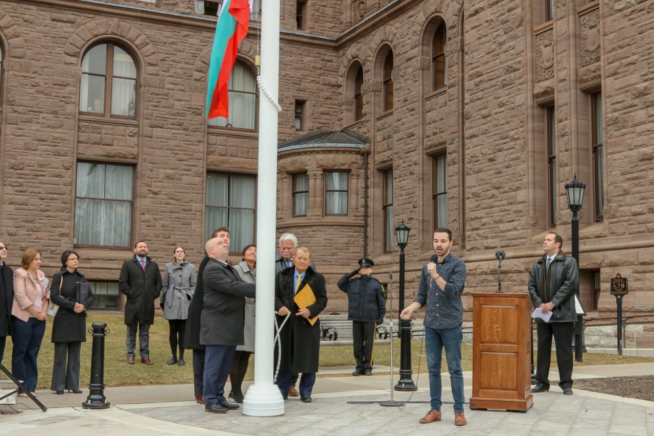 Българският генерален консул Петър Крайчев приветства участниците в церемонията и изрази признателност към Законодателното събрание на Онтарио за възможността България да бъде фокус в правителствения комплекс Queen’s Park. Той проследи двустранния и многостранен диалог с Канада в контекста на Българското председателство на Съвета на ЕС, направи преглед на свързаните с Освобождението и Националния празник събития и призова за минута мълчание в памет на геройски загиналите за свободата на България.