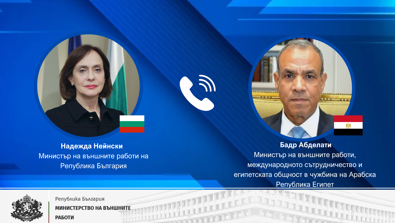 Министър Надежда Нейнски проведе телефонни разговори с Бадр Абделати, министър на външните работи, международното сътрудничество и египетската общност в чужбина на Арабска република Египет, и с Абдулла бин Зайед ал Нахаян, министър на външните работи на ОАЕ