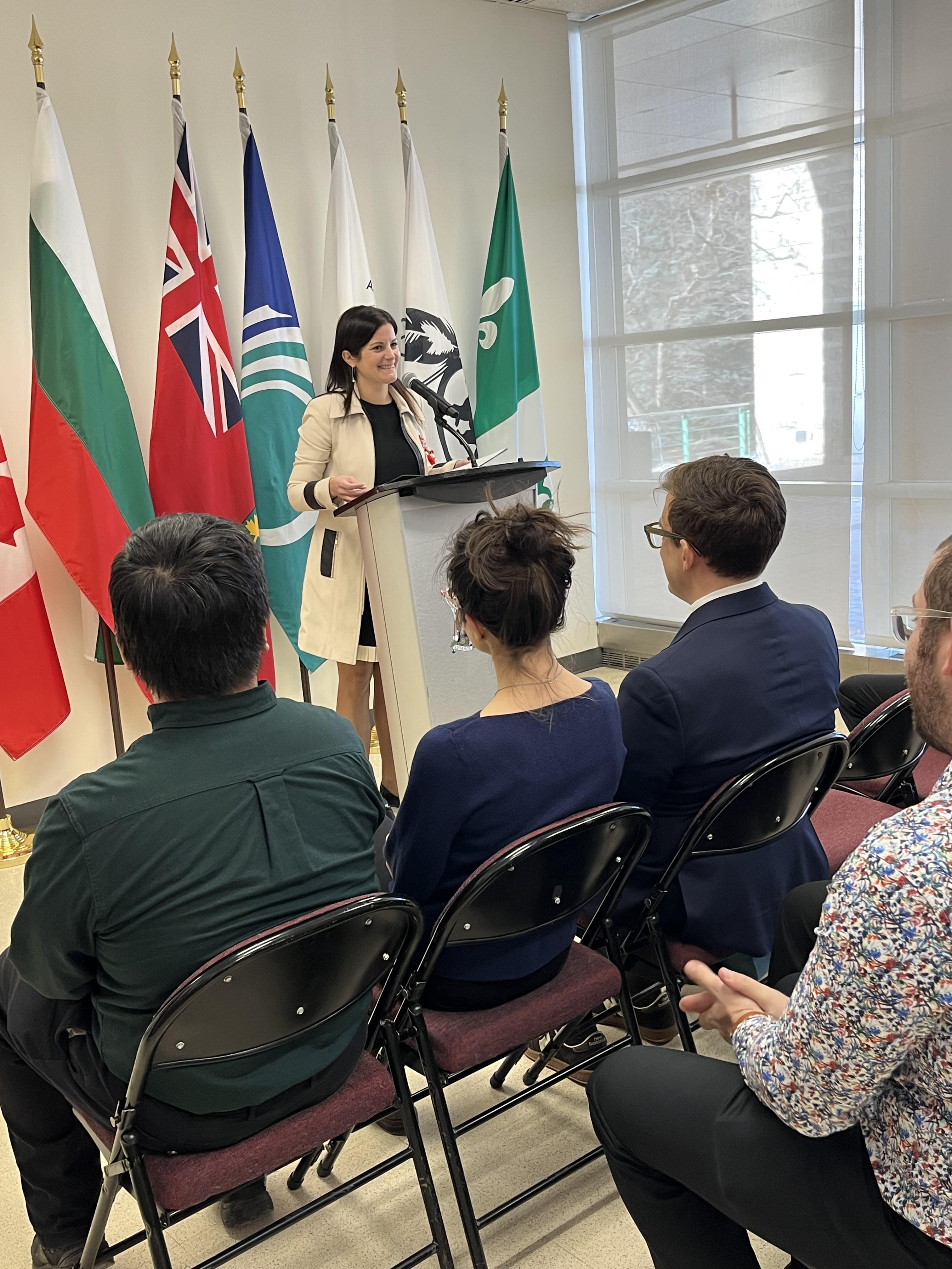 Обръщение към гостите направи г-жа Джована Мингарели, член на канадския парламент и съпредседател на Групата за приятелство между Канада и България в канадския парламент. Тя поздрави сънародниците ни с празника и изтъкна важността на българската диаспора от столичния район за развитието на местните общности.