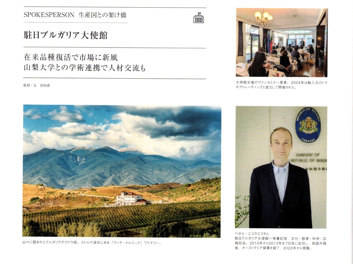 В своя брой за юли-август 2025 г. японското специализирано списания за вино и алкохол WANDS публикува интервю с Петър Николаев, първи секретар в Посолството на Република България в Токио. Статията представя традициите на винопроизводството в България, културата на виното у нас и възможностите за сътрудничество, които съществуват между България и Япония в сферата на лозарството и винарството, в т.ч. в научната и академична област. В интервюто са представени стартиралите по инициатива на посолството разговори за партньорство между Института по лозарство и винарство – Плевен и Университета за хранителни технологии – Пловдив и Научноизследователския център по лозарство и винарство към Университета Яманаши.