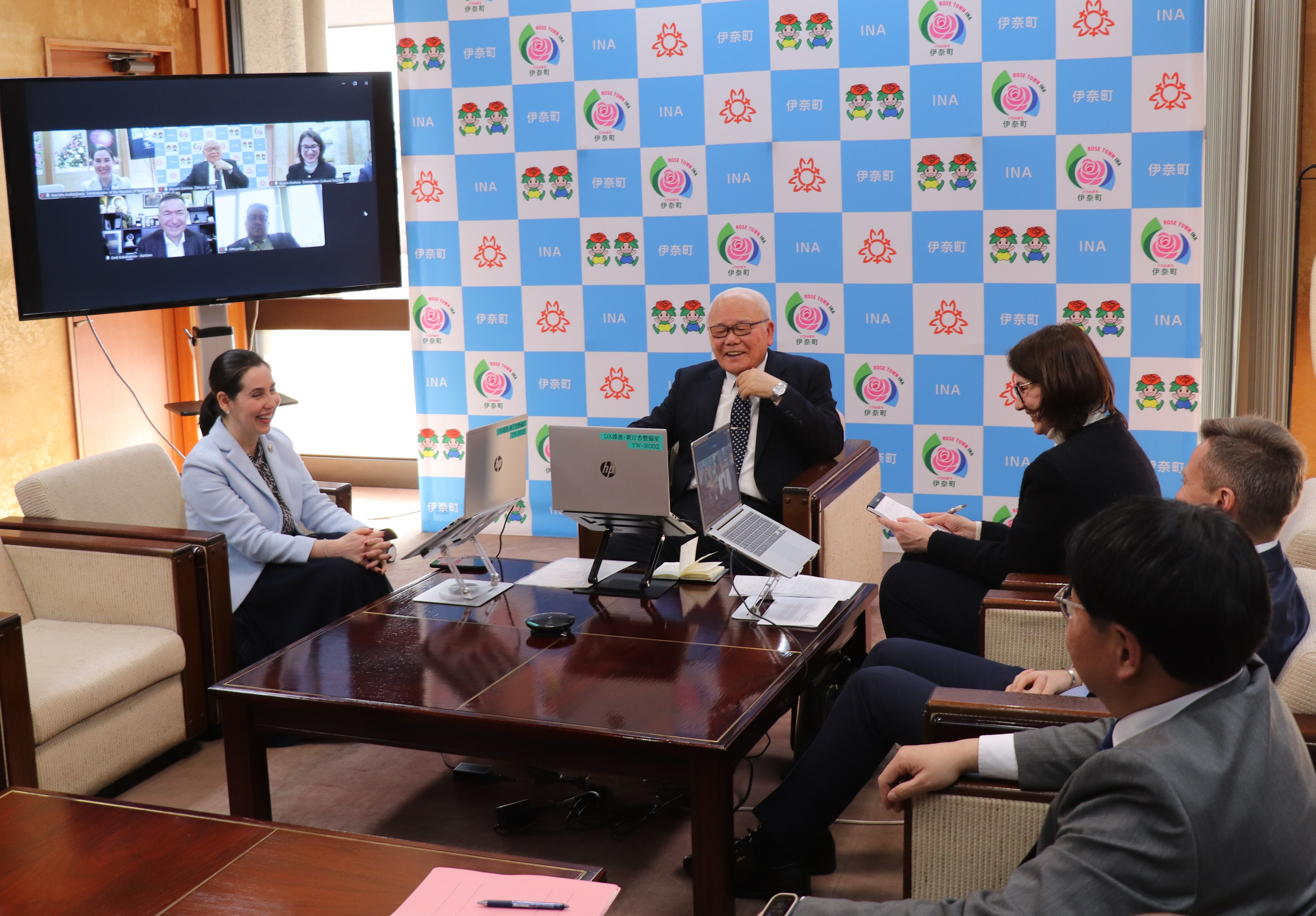 На същият ден в кметството се състоя онлайн среща между кмета на гр. Ина и кмета на гр.Карлово, с участието на посланик Арабаджиева. По време на срещата бяха обсъдени детайли относно посещението на д-р Емил Кабаиванов начело на делегация от гр. Карлово в началото на месец май за участие в празника на Розата на гр.Ина и подписване на меморандум за сътрудничество, както и за реципрочното посещение на г-н Ошима в гр.Карлово на Празника на розата на града.