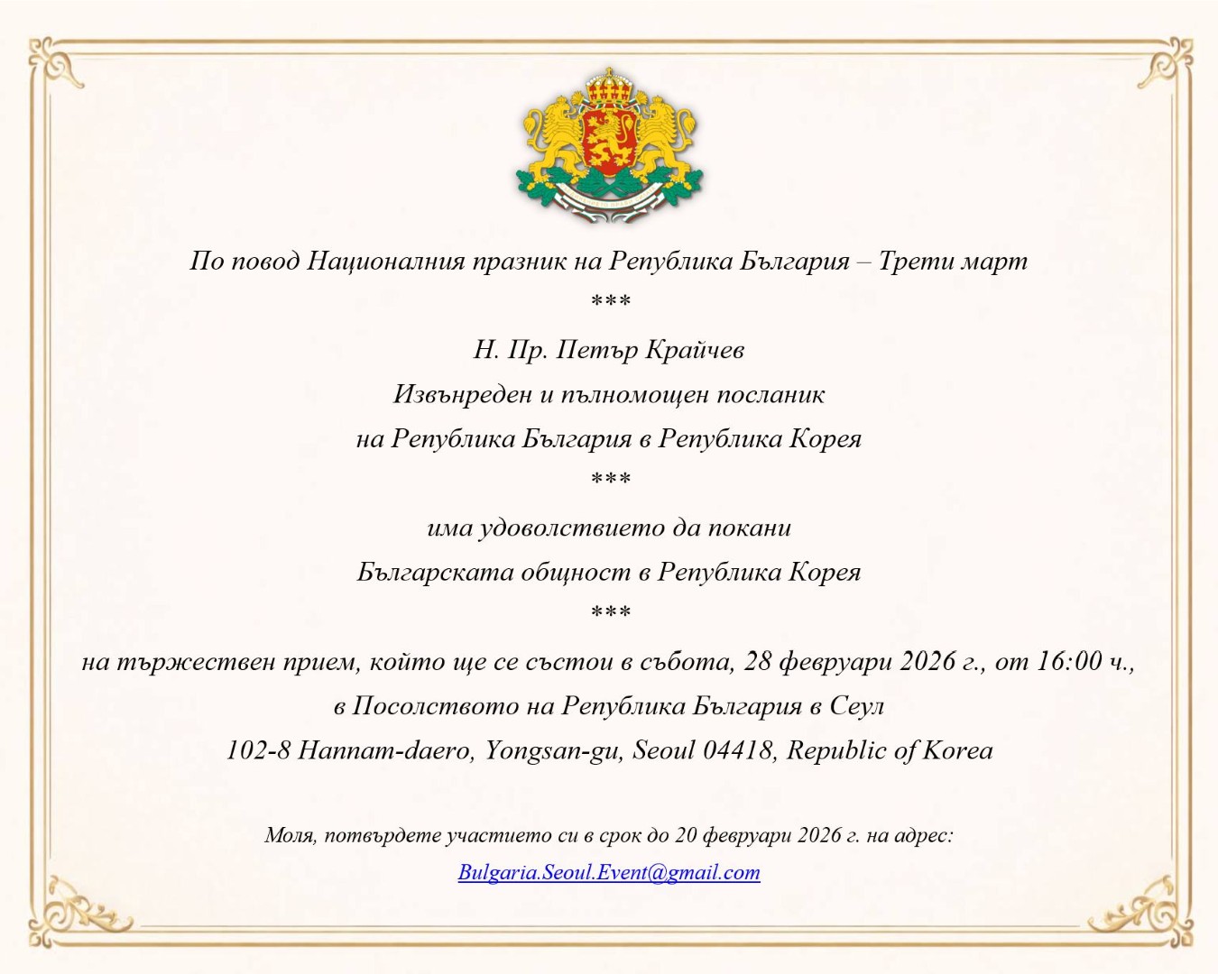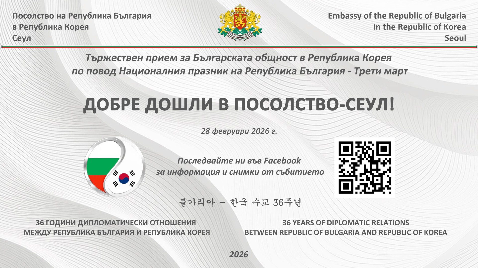 Националният празник на Република България – Трети март – бе тържествено отбелязан и с прием за българската общност в Посолство-Сеул на 28 февруари 2026 г.