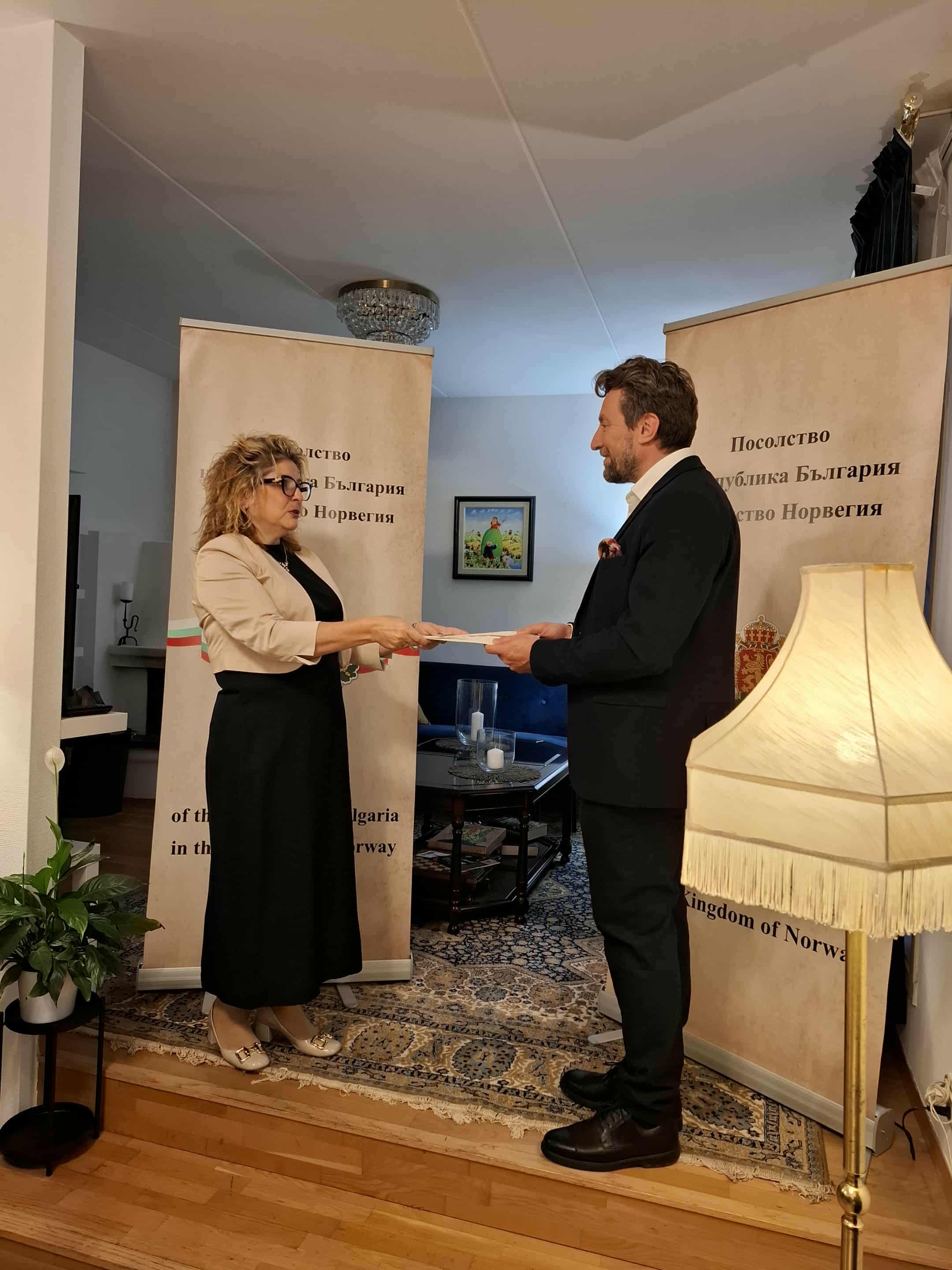 Извънредният и пълномощен посланик на Република България в Кралство Норвегия г-жа Десислава Иванова връчи на тържествена церемония в българската резиденция в Осло екзекватурата и консулския патент на първия почетен консул на Република България в Кралство Норвегия г-н Кирил Кутин.