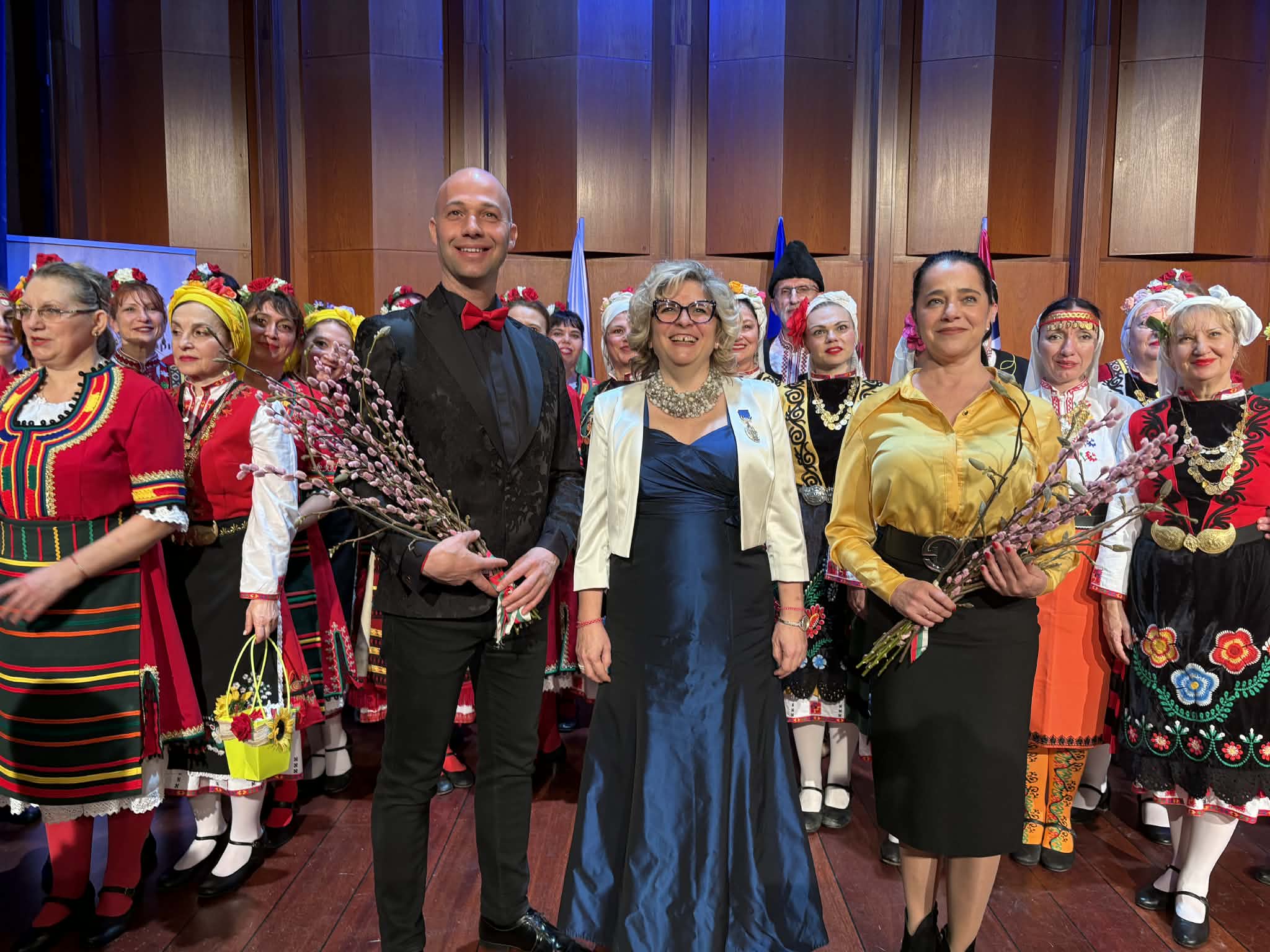 В края на вечерта посланик Иванова се обърна на български език към сънародниците ни в залата, като, освен Националния празник, „на патерица“ им честити и Баба Марта с послание „за здраве и за устойчивост на традициите, които и далеч от Родината ни напомнят, че сме българи“. Посолството отправи музикален поздрав към всички тях с „Моя страна, моя България“ на Емил Димитров, което естествено разчувства и просълзи мнозина.