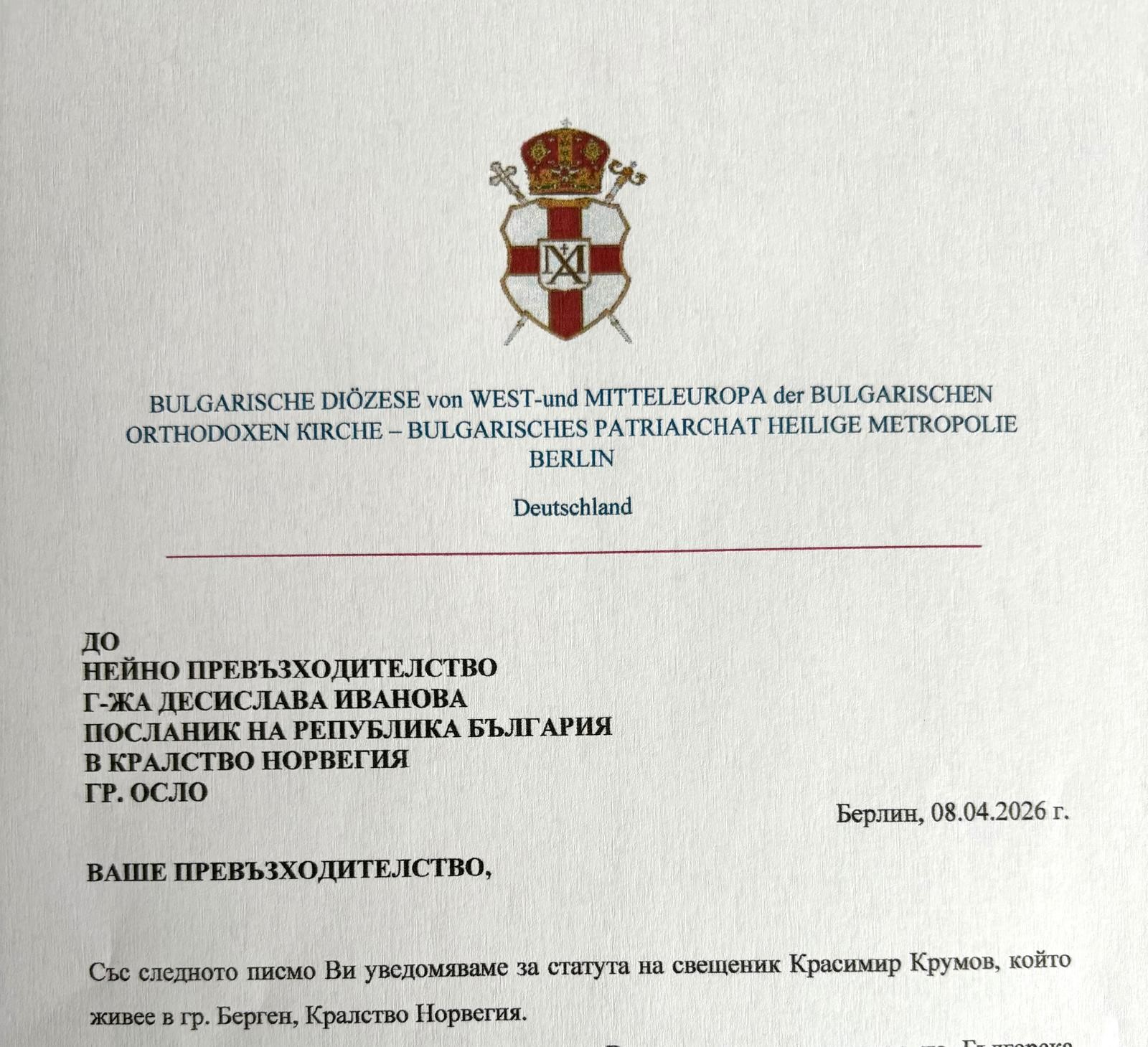 В навечерието на Великденските празници имаме удоволствието да съобщим добрата новина за получено писмо до извънредния и пълномощен посланик на Република България в Кралство Норвегия Н. Пр. г-жа Десислава Иванова от Западно- и Средноевропейския митрополит Антоний, в което той уведомява, че Епархийският съвет в свое заседание на 9 декември 2025 г. е дал своето благословение на свещеник Красимир Крумов духовно да обгрижва православните българи в Кралство Норвегия.