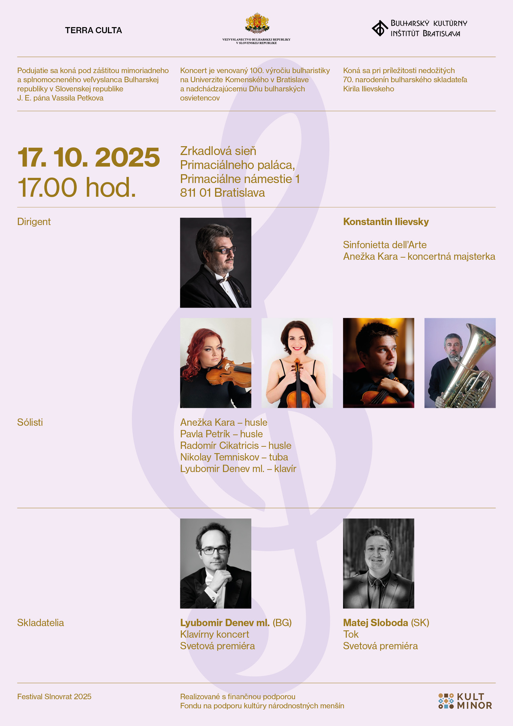 Концертът бе организиран съвместно от Посолството, гражданското сдружение „Тера култа“ и Българския културен институт в Братислава и бе реализиран с финансовата подкрепа на Фонда за подкрепа на културата на националните малцинства в Словакия.