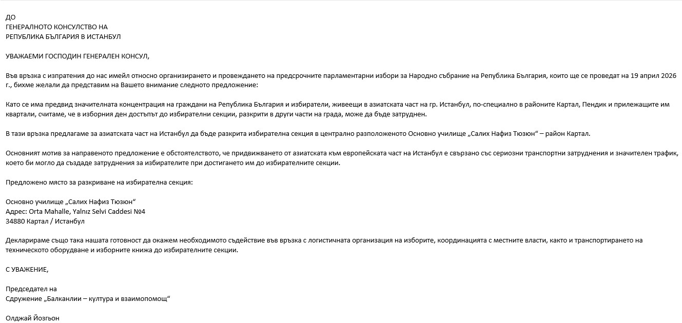 Предложение от организация на български граждани за образуване на избирателна секция в район Картал, Истанбул