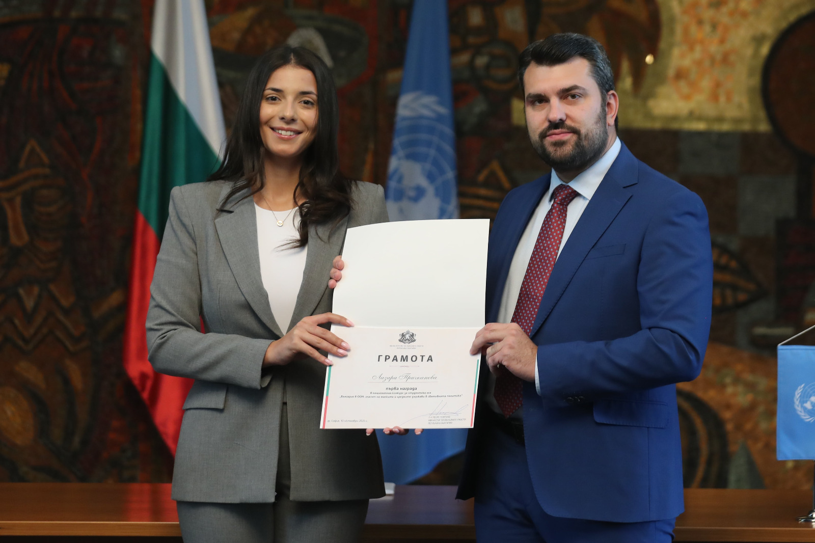 The first prize in the competition was awarded to Lazara Prichkapova, who will join the Bulgarian delegation to the 80th Session of the United Nations General Assembly in New York. The finalists Yordan Petrov, Nikolay Shukerov, and Ivana Yotova received certificates and commendation awards.