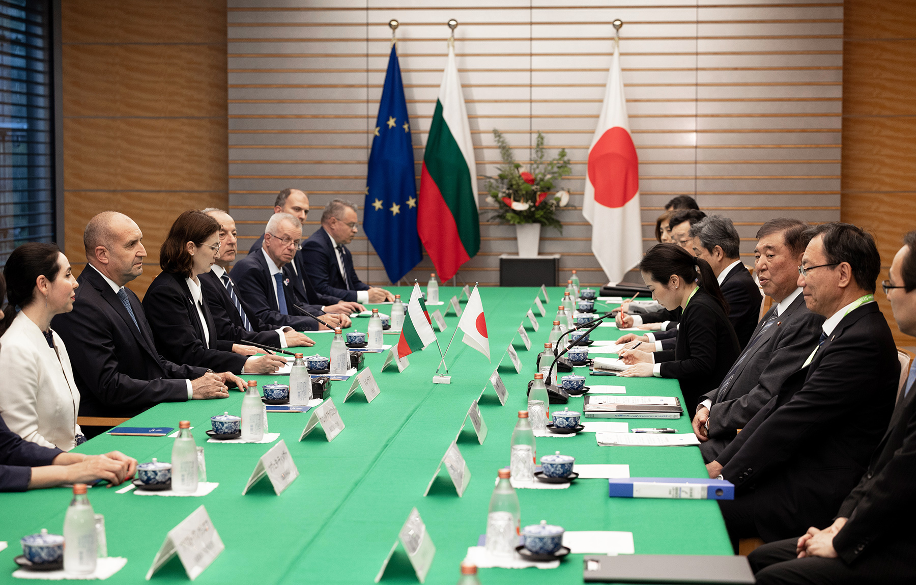 夕方、石破茂総理大臣と首脳会談を行い、引き続き総理大臣主催のワーキング・ディナーに参加しました。両首脳は、両国関係を新たに「戦略的パートナーシップ」に格上げする「日・ブルガリア戦略的パートナーシップ構築に関する共同声明」に署名しました。