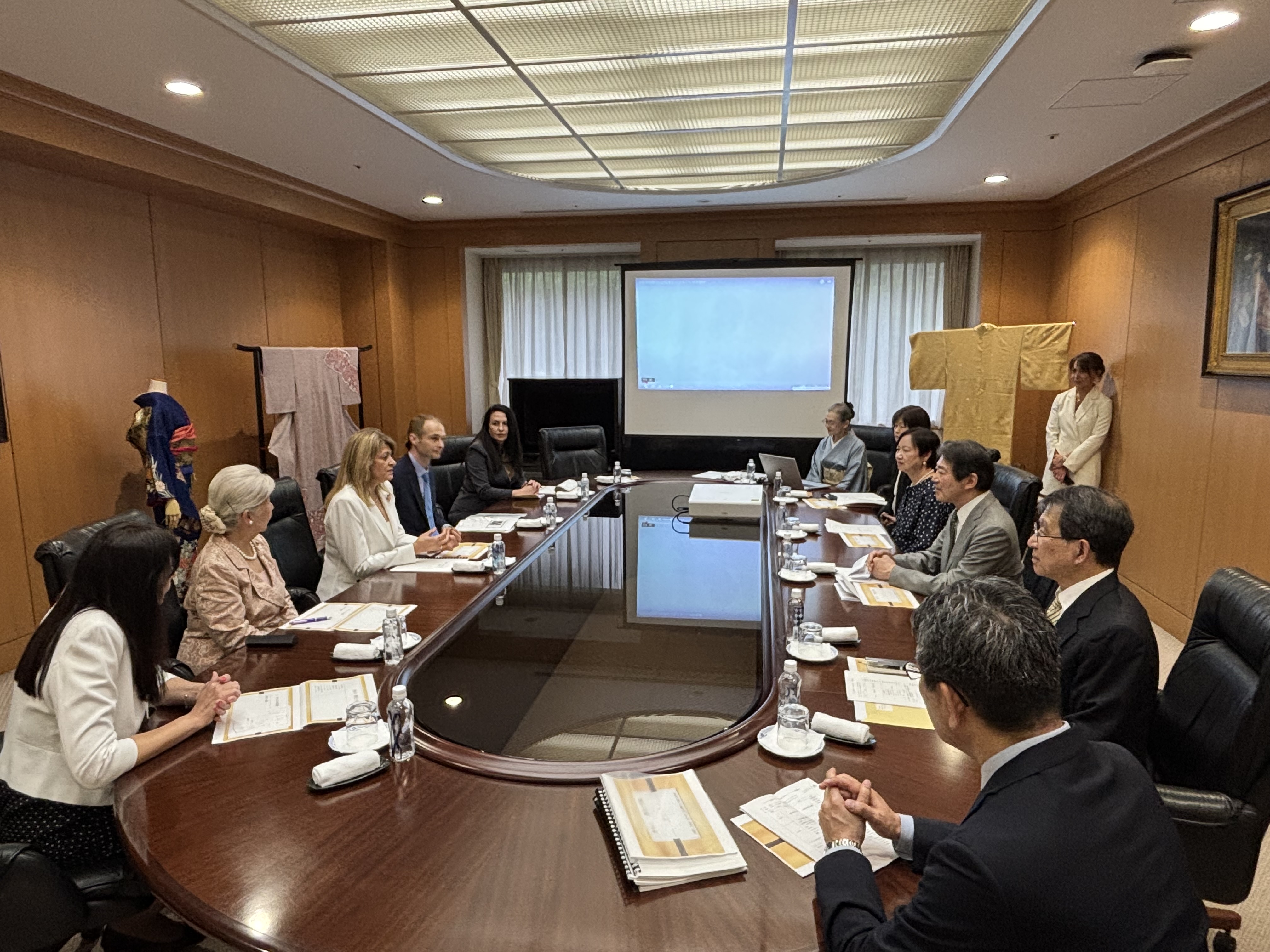 同じ日にラデヴァ大統領夫人は文化学園大学を訪問し、清木孝悦総長と会談し、現在ブルガリア大使館と文化学園大学が取り組んでいるプロジェクトや将来のイニシアチーブについて意見交換をしました。また文化学園服装博物館も訪問し、日本の着物の文化についてレクチャーを受けました。