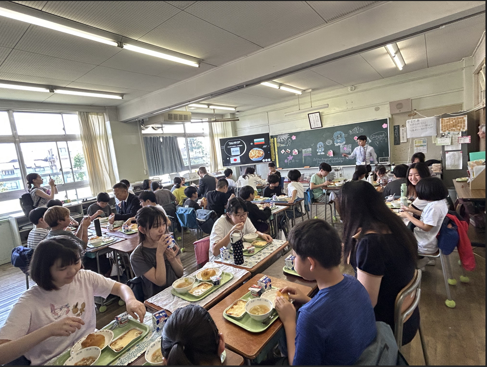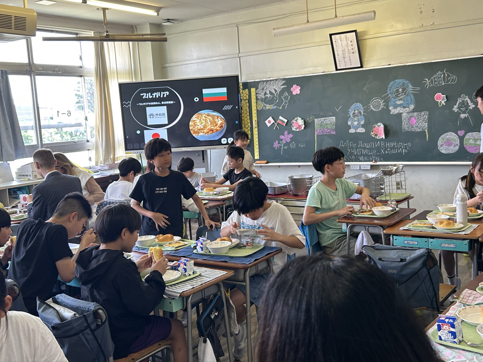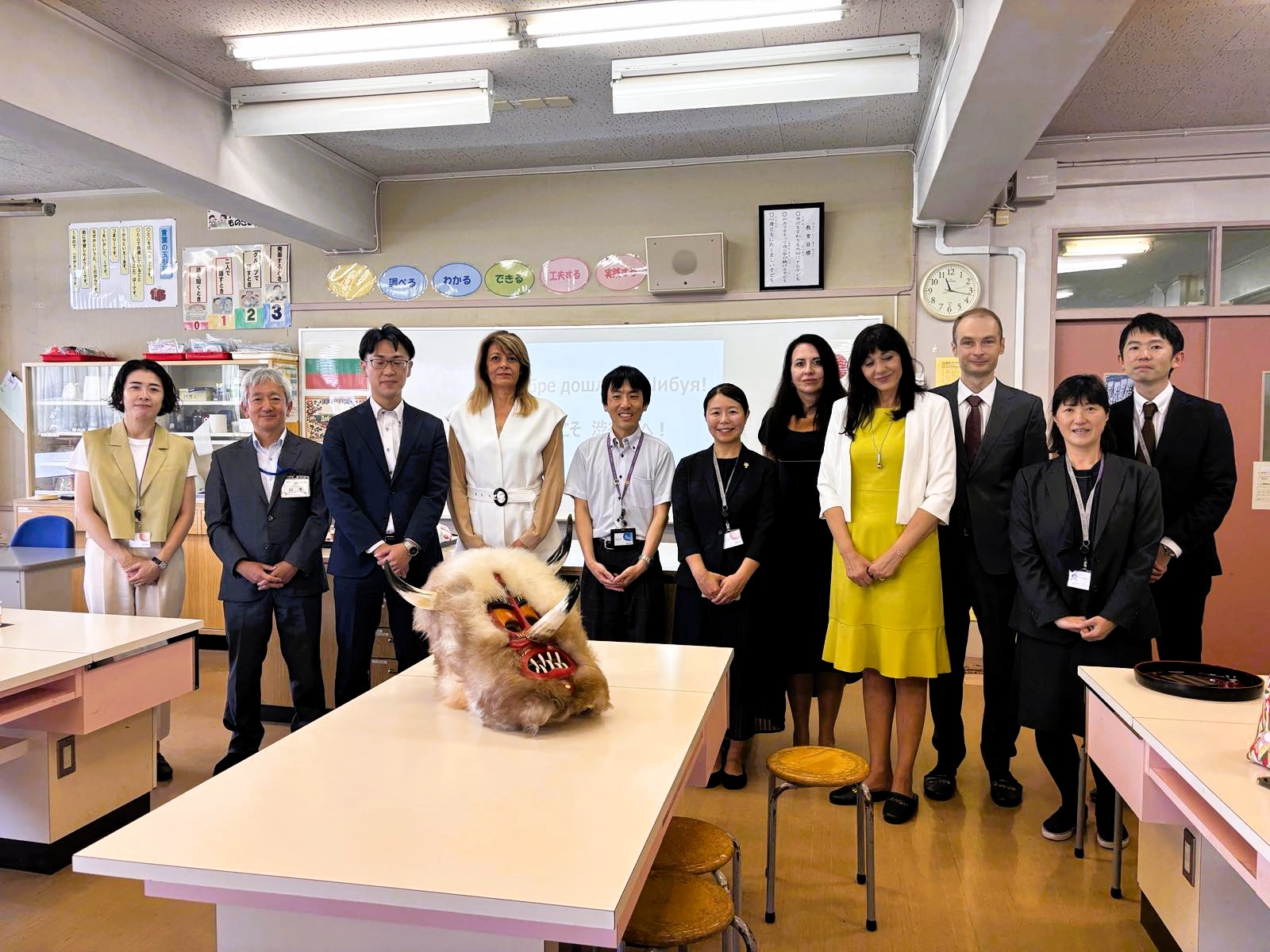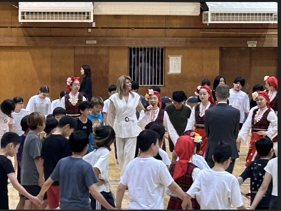 5月20日に大統領夫人は渋谷区立幡代小学校を訪問しました。訪問中、ラデヴァ夫人は日本の教育制度の特徴や、日本の学校における教育取組について理解を深めました。6年生が「ソーラン節」で歓迎の踊りを披露し、ラデヴァ夫人は「KOGA」ダンスグループの皆様とブルガリア民族舞踊を教え、子供たちと交流しました。ラデヴァ夫人はブルガリアからの学校への特別な贈り物、悪霊を追い払う「クケリのマスク」をお土産として山本校長に贈りました。ダンスの交流と学校見学の後、大統領夫人は生徒たちと教室で給食をいただきました。当日の給食メニューはブルガリアの伝統料理が提供され、子供たちは大変喜んでいました。年内には渋谷区内の他の小中学校や幼稚園でもブルガリア料理の メニューが提供される予定です。