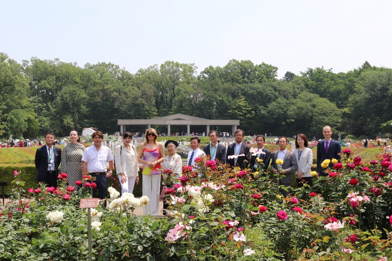 21日にラデヴァ大統領夫人は調布市にある神代植物公園を訪問し、公園では東京都建設局本木公園緑地部長、松井神代植物公園長、尾崎東京都都議会議員、調布市本田副市長、宮本調布市市議会議員や多くの公園と調布市関係の方々に迎えられました。ラデヴァ夫人は公園にブルガリアのダマスクローズを贈り、公園からはそのお返しに日本の「桃錦」ツバキをいただきました。