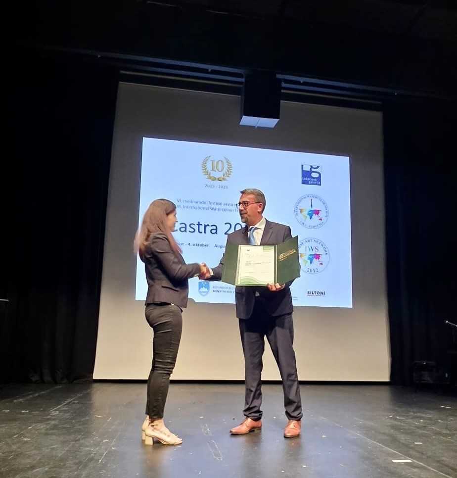 Je med deseterico tujih in slovenskih umetnic ter umetnikov, ki so prejeli častne diplome o njihovi udeležbi na šesti ediciji tega bienala. V navzočnosti ajdovskega župana Tadeja Beočanina so bili nagrada Castre`25 in odličja v imenu občine gostiteljice, sponzorjev in prirediteljev podeljeni akvarelistom s Finske, Hrvaške, iz Avstrije in Slovenije.