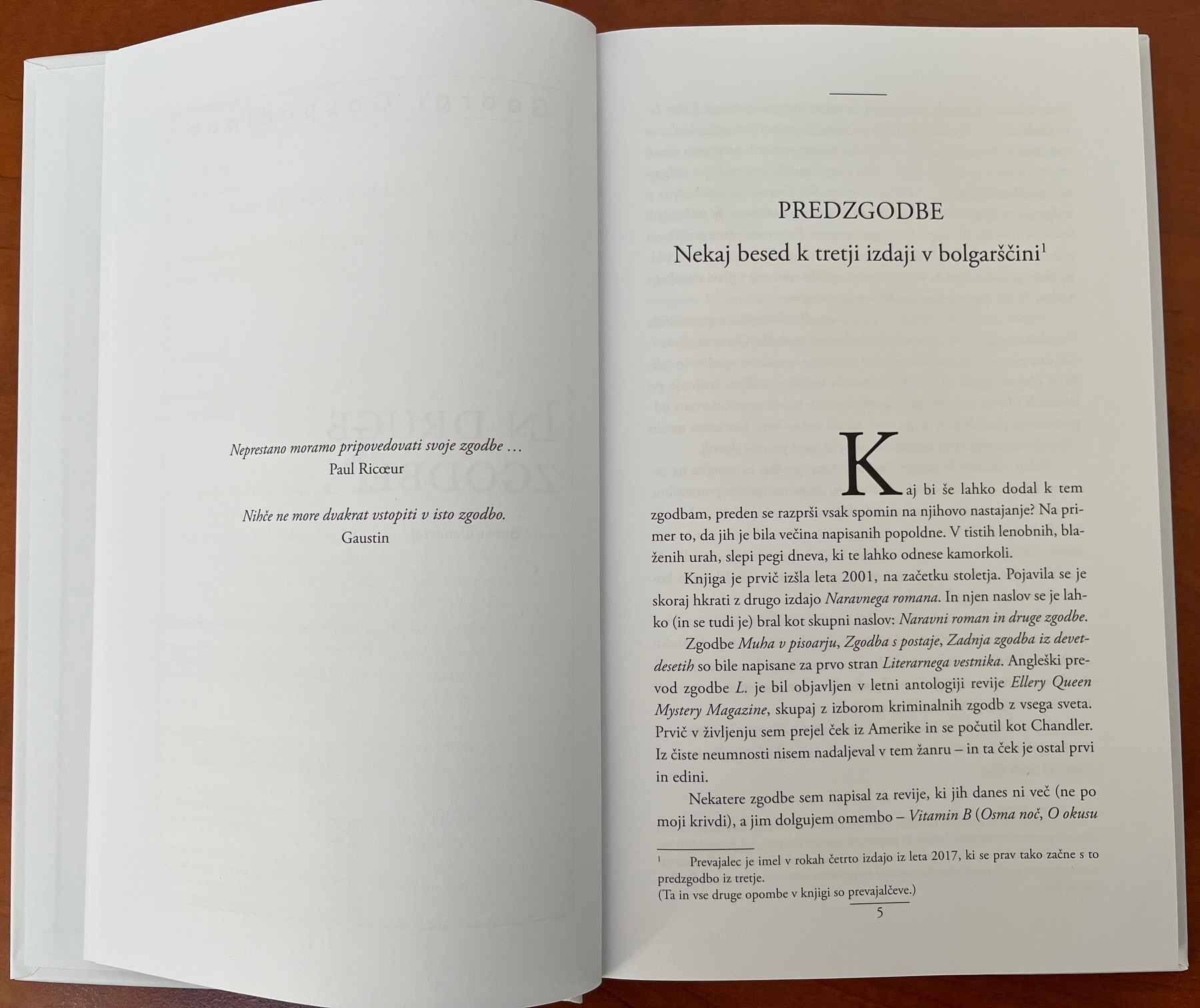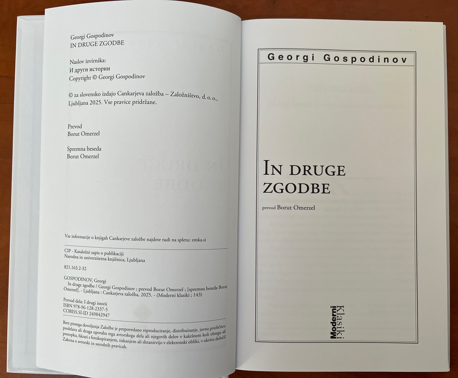 Knjiga In druge zgodbe pisatelja in pesnika Georgija Gospodinova je izšla v slovenskem prevodu. Nedavno tega pa so jo predstavili v Ljubljani na dogodku Cankarjeve založbe, ki letos zaznamuje 80. obletnico svoje ustanovitve. Zbornik kratkih zgodb je 143. knjiga v ugledni zbirki Moderni klasiki te založbe, katere v sklopu so v zadnjih 24-ih letih bralkam in bralcem približevali dela Bernharda Schlinka, Iana Fleminga, Patricka Modiana, Olge Tokarczuk, Harukija Murakamia ter drugih nagrajevanih sodobnih pisateljic in pisateljev.