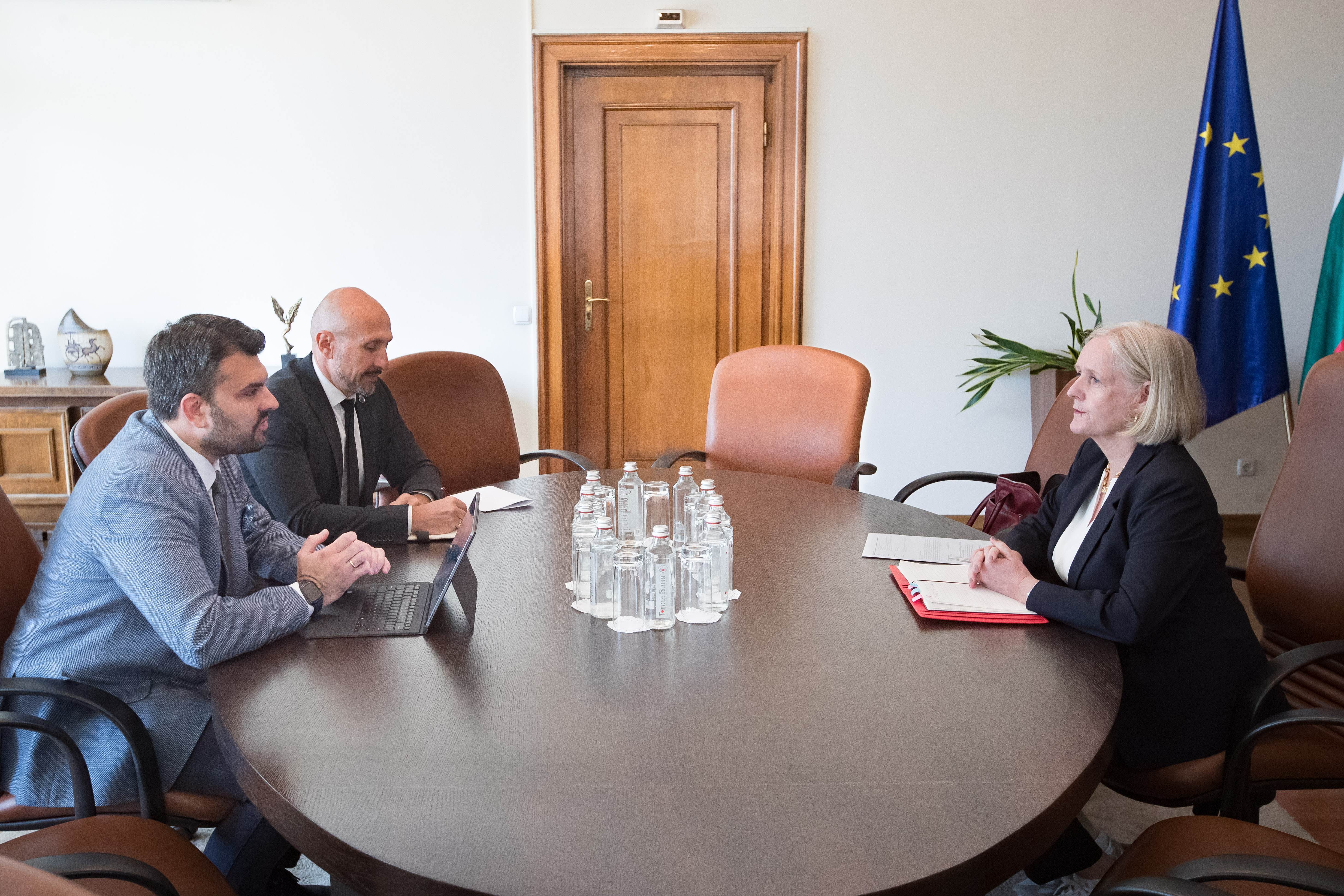 Днес, 05.08.2025 г., министър Георг Георгиев прие за прощална среща посланика на Кралство Швеция в България Н. Пр. г-жа Катарина Рангнит. Министърът отбеляза положените усилия от страна на шведския посланик за укрепване на сътрудничеството между двете държави и използва възможността да благодари за предоставените от шведската страна специализирани самолети, които се включиха в гасенето на горските пожари в Пирин.