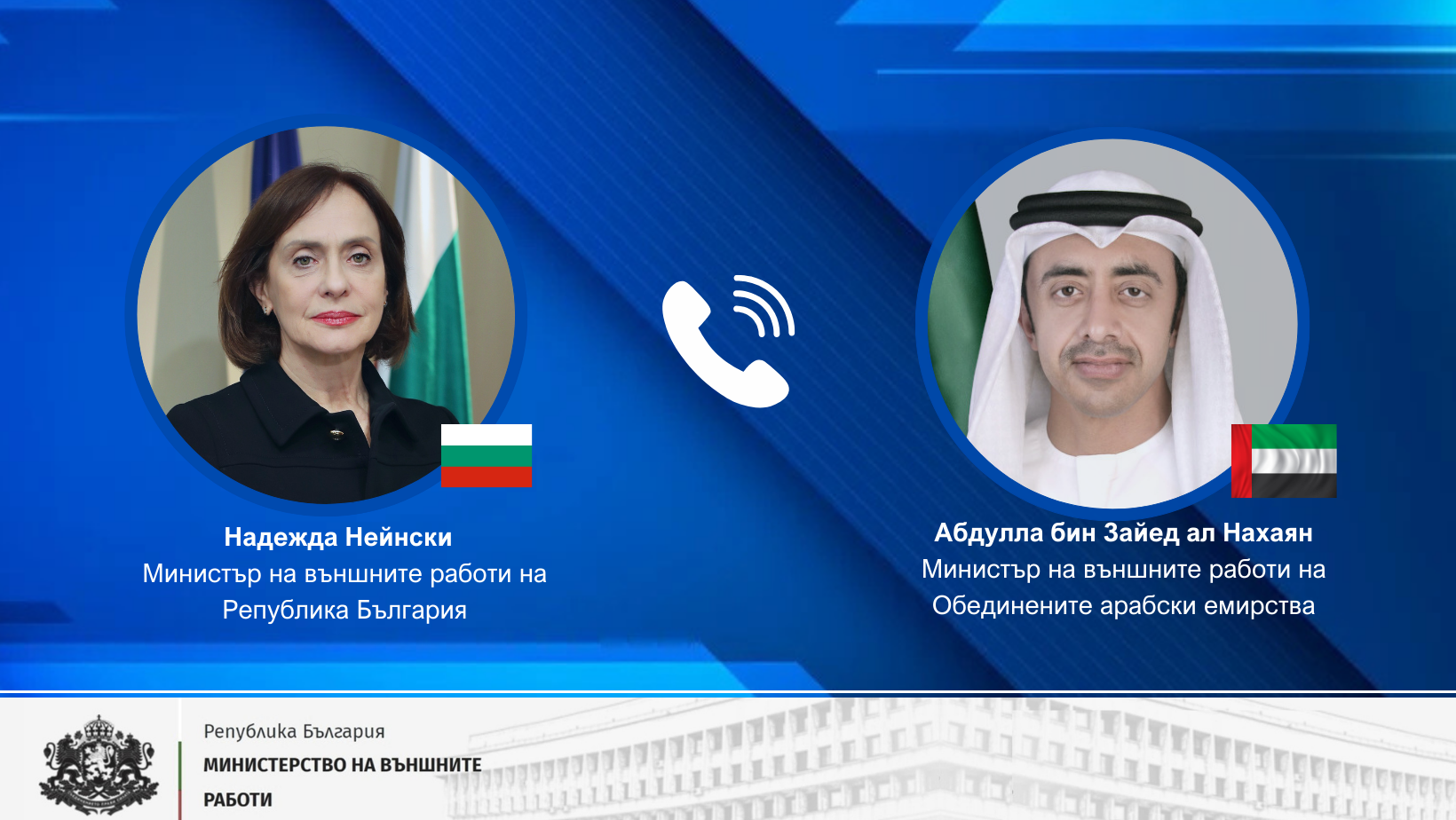 По инициатива на българската страна бе проведен телефонен разговор на министър Надежда Нейнски и с външния министър на ОАЕ Абдулла бин Зайед ал Нахаян. Министър Нейнски категорично осъди иранските атаки срещу територията и суверенитета на ОАЕ и изрази солидарност с емиратския народ в този критичен момент. Изказа благодарност за усилията на емиратската страна за осигуряването на безопасността на всички български граждани, които в момента се намират на територията на ОАЕ, като отбеляза, че ще продължим да разчитаме на съдействие.