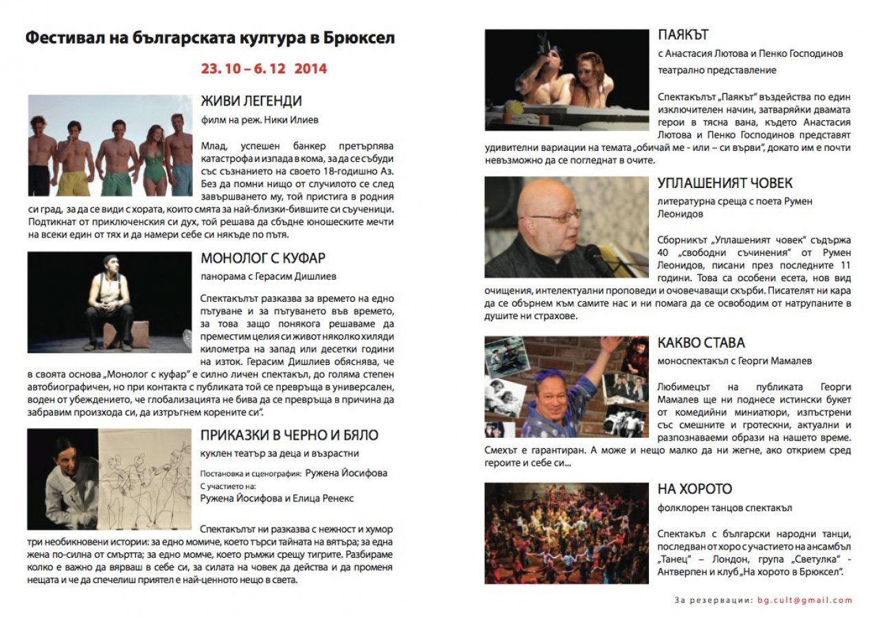 Фестивалът на българската култура в Брюксел, на който частичен спонсор е и българското посолство в белгийската столица, ще продължи около месец, като ще бъдат представени разнообразни творби и представления в областта на българското кино, театър и музика.