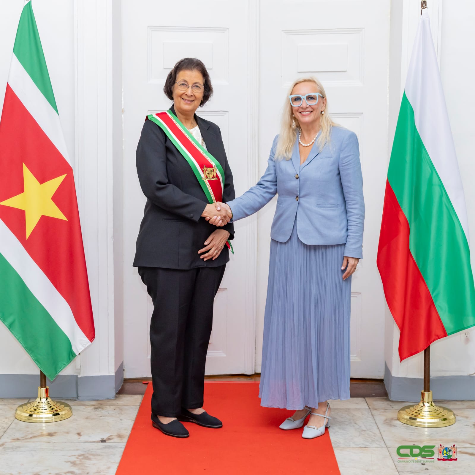 Посланикът на Република България във Федеративна република Бразилия, акредитиранa и за Република Суринам, Н. Пр. Елеонора Димитрова връчи акредитивните си писма на президента на Република Суринам Дженифър Гирлингс-Симонс на церемония, състояла се на 12 март 2026 г. в Президентския дворец в Парамарибо.