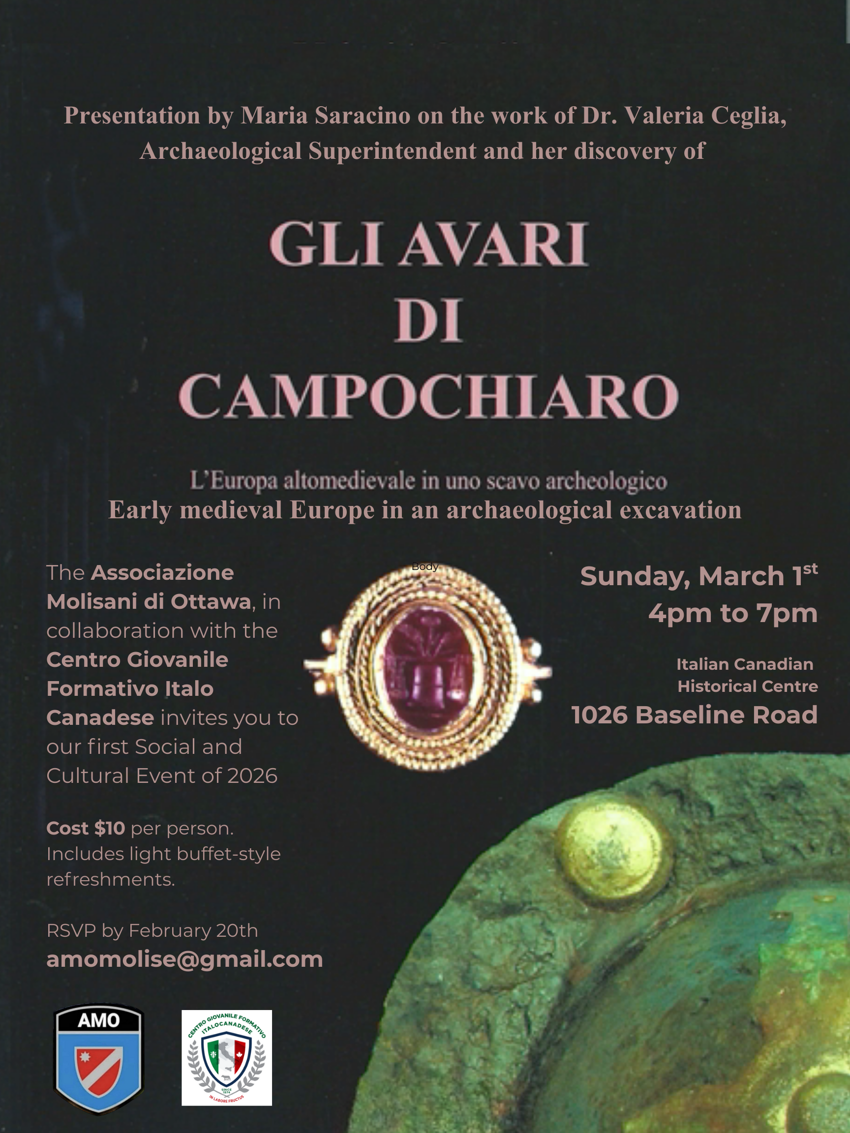 На 1 март 2026 г. след проведената тържествена церемония по издигане на българското знаме в канадската столица от Посолството на Република България по случай Националния празник на България, за което информирахме по-рано, в Италианския културен център в Отава бе направено представяне на дългогодишния труд на италианския археолог д-р Валерия Челия (Dr. Valeria Ceglia), касаещ средновековно археологическо откритие в Молизе, Италия. Информацията за него бе представена от Мария Сарачино, признат местен художник и скулптор, както и от Анна Романо президент на „Асоциация Молисани“ в Отава и Кристина дел Кастело, президент на „Centro Giovanile Formativo Italo-Canadese“, под чието съвместно домакинство се проведе събитието.