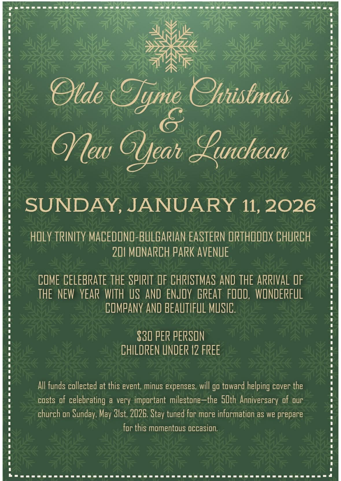 Традиционното тържество и благотворителен обяд на Македоно-българската източноправославна църква „Света Троица“ по случай Коледа и Нова година по стар стил се проведе на 11 януари 2026 г., след неделната църковна служба, в празничната зала към църквата и бе посетено от около 130 души – представители на старата българска емиграция – главно от Егейска Македония и от по-новата емиграция от България. Тържеството се провежда ежегодно от основаването на църквата през 1976 г. и носи заряда и емоциите от времето на предците - основатели на църквата. Тази година средствата от благотворителния обяд и даренията на енориашите се събират за отбелязване на 50-тата годишнина от основаването на църквата, което ще се проведе на 31 май 2026 г. /храмовия празник на църквата/.