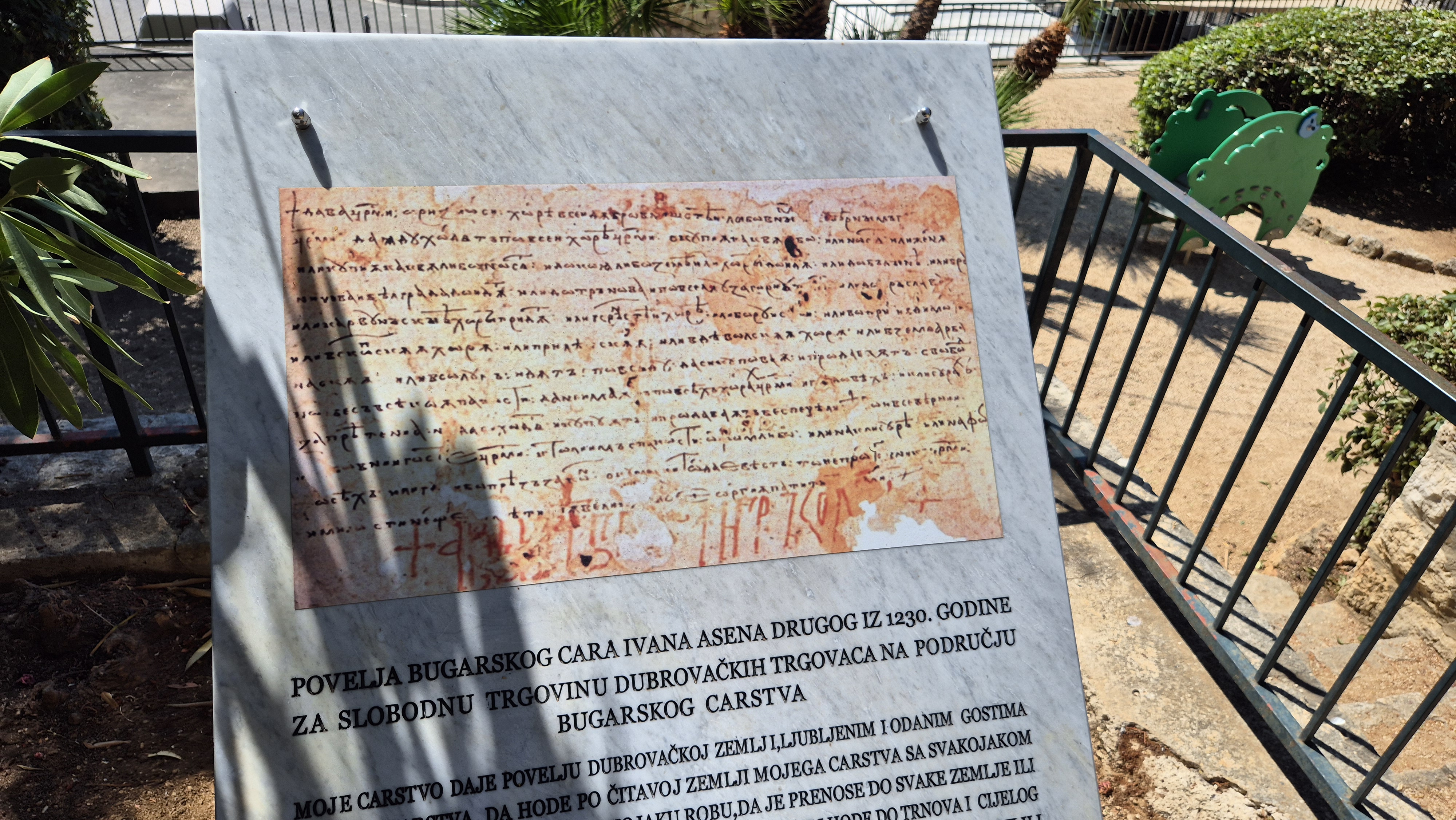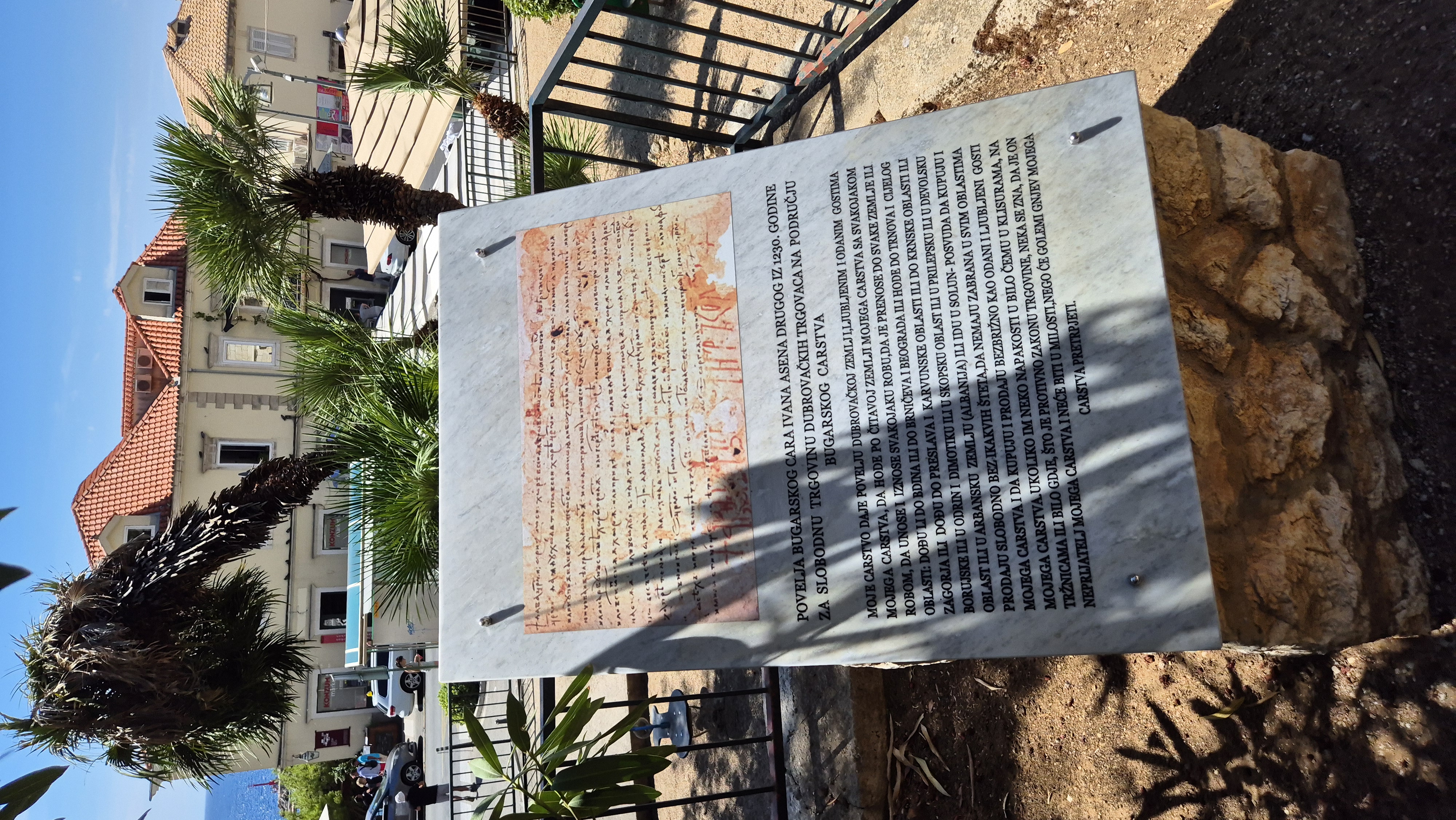 Възстановяване на паметната плоча с откъс от Грамотата на цар Иван-Асен II, дадена на дубровнишките търговци за свободна търговия на територията на Българското царство приблизително през 1230 г. в парка при източния вход на крепостните стени на стария град в Дубровник