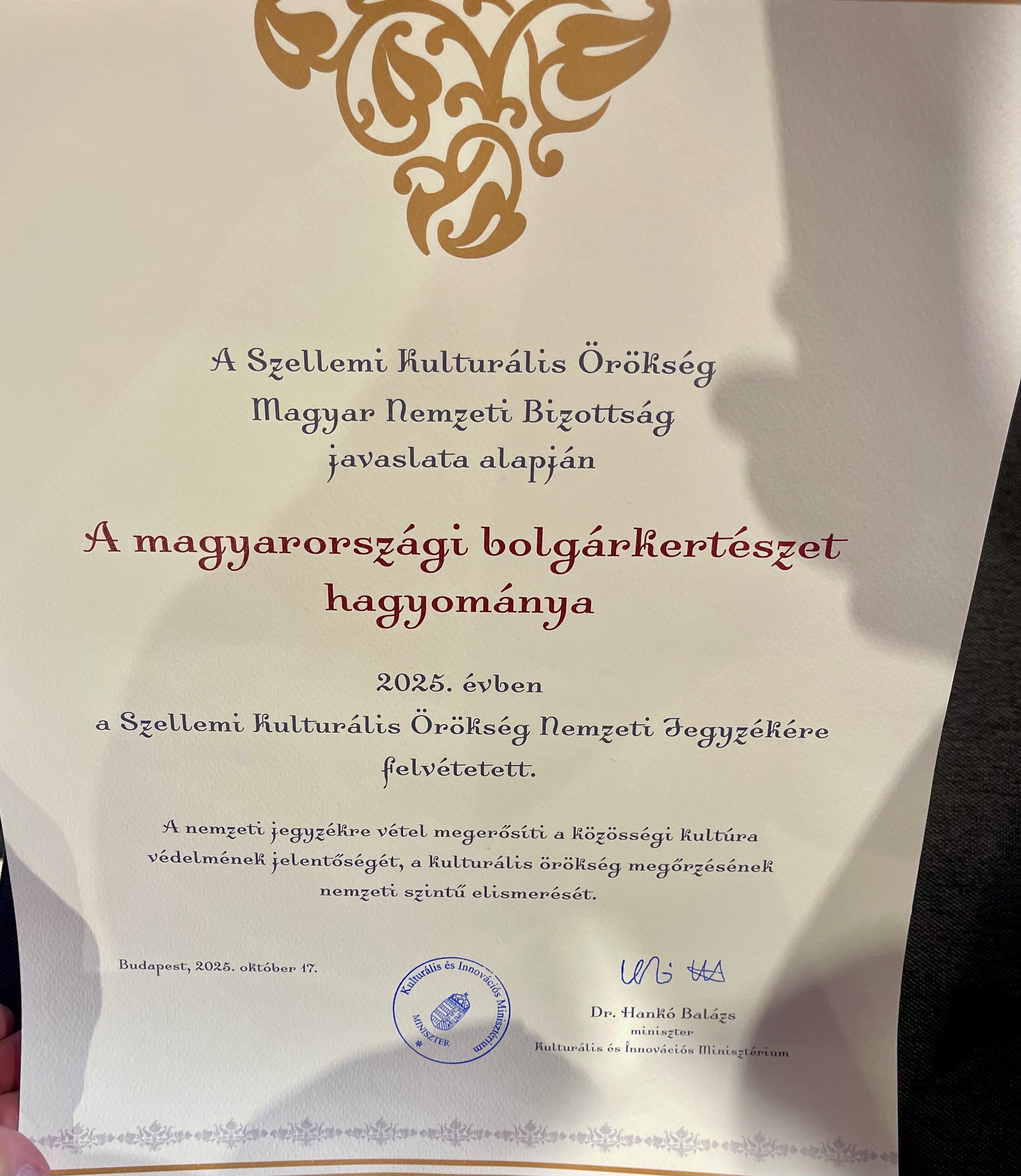 На 17 октомври 2025 г. в гр. Сентендре, Унгария, се състоя тържествена церемония по връчването на удостоверението за вписването на Традицията на българското градинарство в Унгария в Националния регистър на Унгария за нематериално културно наследство на ЮНЕСКО. Събитието бе организирано от Националната комисия за ЮНЕСКО на Унгария и се проведе в Етнографския музей на открито. Удостоверението бе връчено от г-жа Анита Киш-Хеджи, държавен секретар в Министерството на културата и иновациите, и д-р Естер Чонка-Токач, директор на Дирекцията за нематериално културно наследство, на д-р Данчо Мусев, председател на Българското републиканско самоуправление, и г-н Димитър Танев, председател на Дружеството на българите в Унгария. Почетен гост на церемонията бе извънредният и пълномощен посланик на Република България в Унгария – г-н Христо Полендаков. Официалната програма завърши с изпълнение от местния български фолклорно-танцов ансамбъл „Янтра“. Предстои и създаването на българска градина в Етнографския музей на открито в гр. Сентендре.