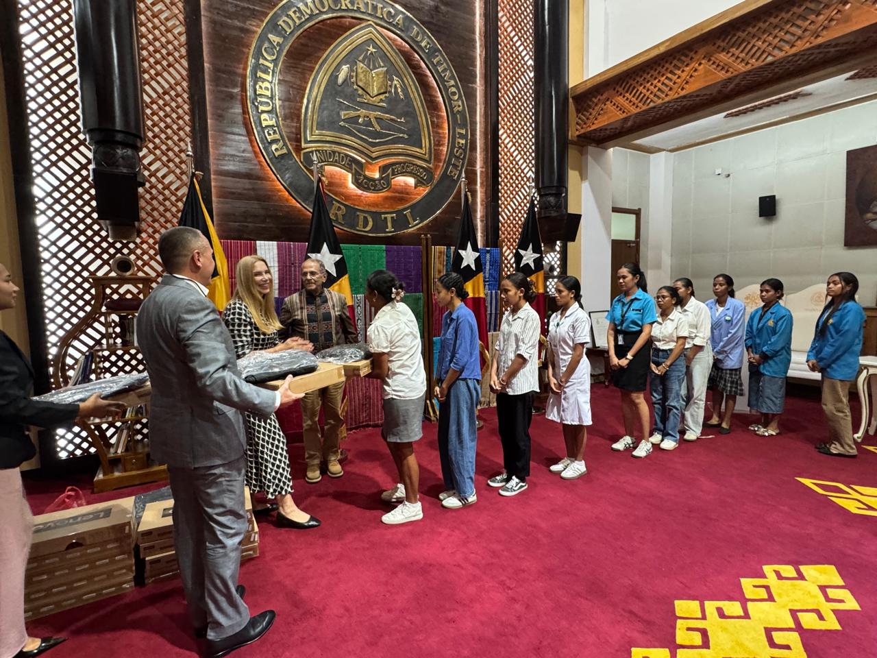 Официална церемония по връчването на 20 лаптопа, дарени от г-н Станислав Коев, почетен консул на Демократична република Тимор-Лесте в Република България, по предложение и със съдействието на Н. Пр. г-жа Таня Димитрова, извънреден и пълномощен посланик на Република България в Индонезия, акредитирана и за Тимор-Лесте, се състоя в церемониалната зала на президентството на Тимор-Лесте на 26 ноември 2025 г.