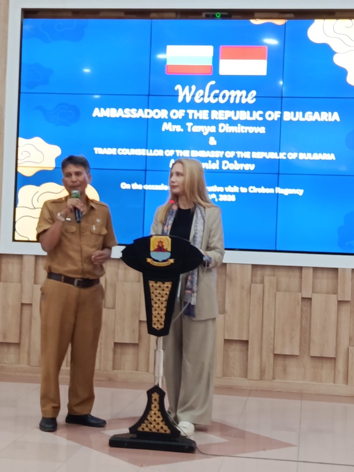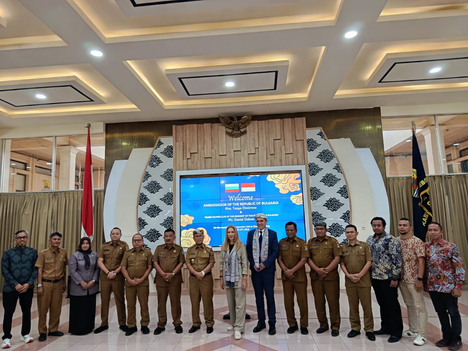Работна среща между посланика на Република България в Индонезия д-р Таня Димитрова и регента на Чиребон г-н Имрон се проведе на 14 април 2026 г. в сградата на местната администрация в Чиребон. В нея участваха представители на ключови икономически и инвестиционни звена на регентството, местната търговско-промишлена палата КАДИН, както и ръководителят на СТИВ в Джакарта г-н Даниел Добрев.