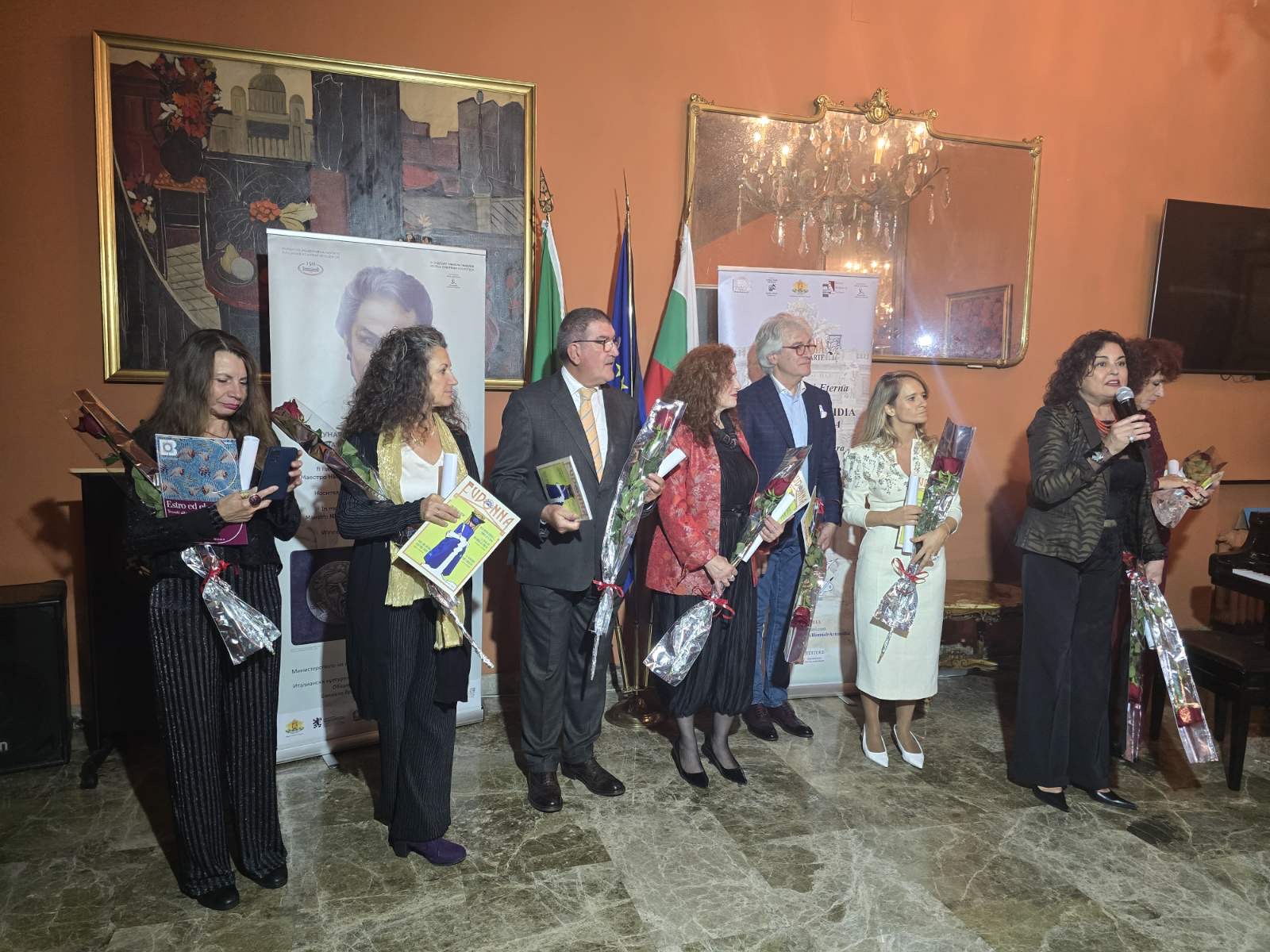 Приветствени слова към участниците отправиха г-жа Eрмелина Пейчева, временно управляващ Посолството на Република България в Италианската република, г-жа Анна Мария Гюзелева, председател на Биенале „Артемидия“ и Фондация „Никола Гюзелев“, проф. Лука Филипони, председател на Menotti Art Festival Spoleto, г-н Джани Латанцио, генерален секретар на Института за чуждестранно сътрудничество, г-жа Венета Ненкова, основател на българското училище „Асен и Илия Пейкови’’ в гр. Рим, г-жа Мария Пиа Чаги, председател на издателство Il Sextante.