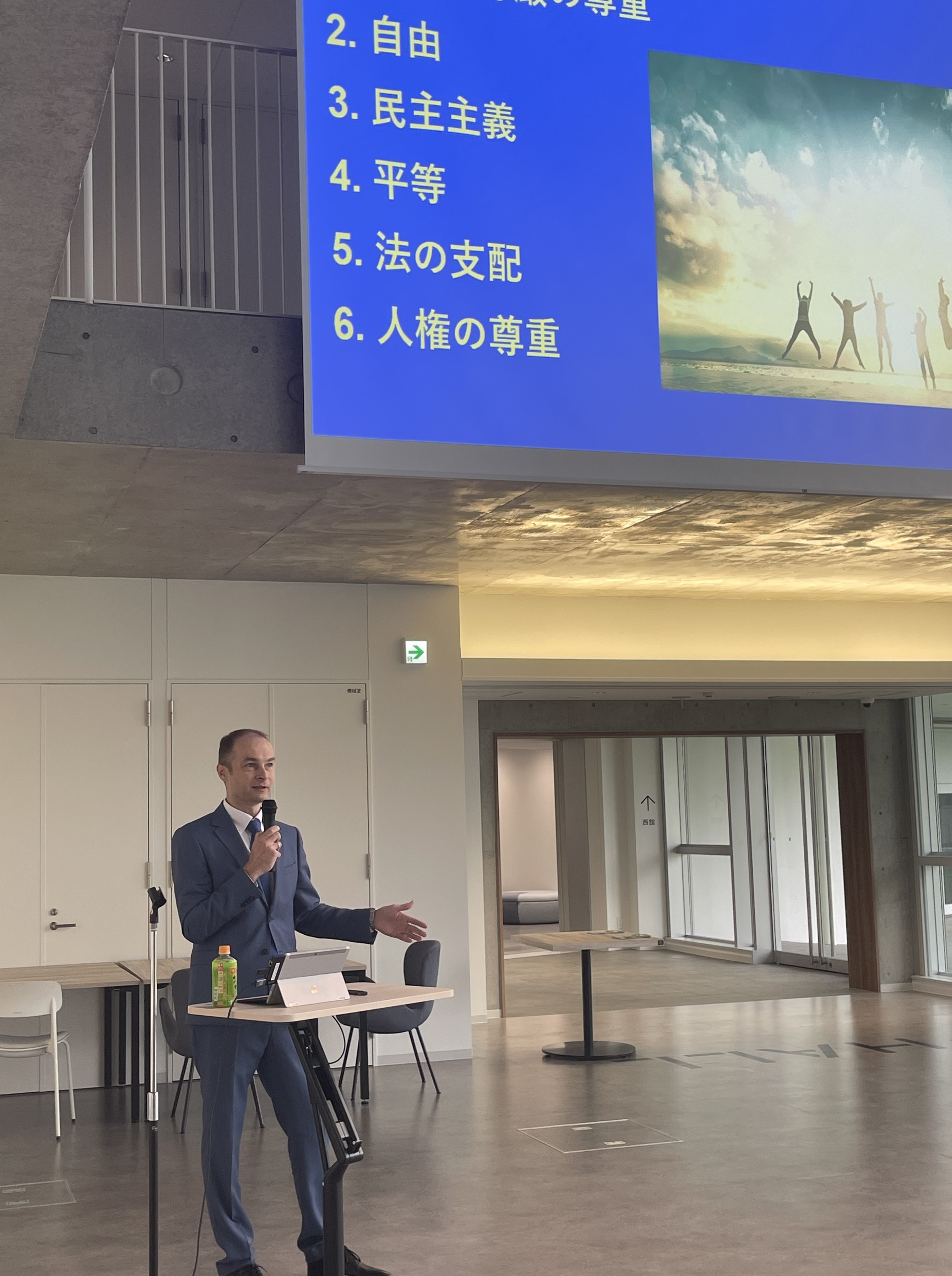 Българският дипломат говори за възникването на ЕС, неговите институции, достижения, политики, както и за отношенията между ЕС и Япония. Представени бяха също важни аспекти, произтичащи от членството на България в ЕС, в т.ч. присъединяването на страната ни към Шенгенското пространство и предстоящото приемане на еврото. Г-н Николаев направи също представяне на България, като говори за нейната история, съвременно икономическо и технологично развитие, природа и култура. По молба на училището служителят на посолството говори също за основните дейности на дипломатическата служба и за професията на дипломата. В последвалата дискусия редица ученици зададоха въпроси относно политиките за борба с климатичните промени, образованието в България, за интересите на българските младежи, както и за отношенията между България и Япония.