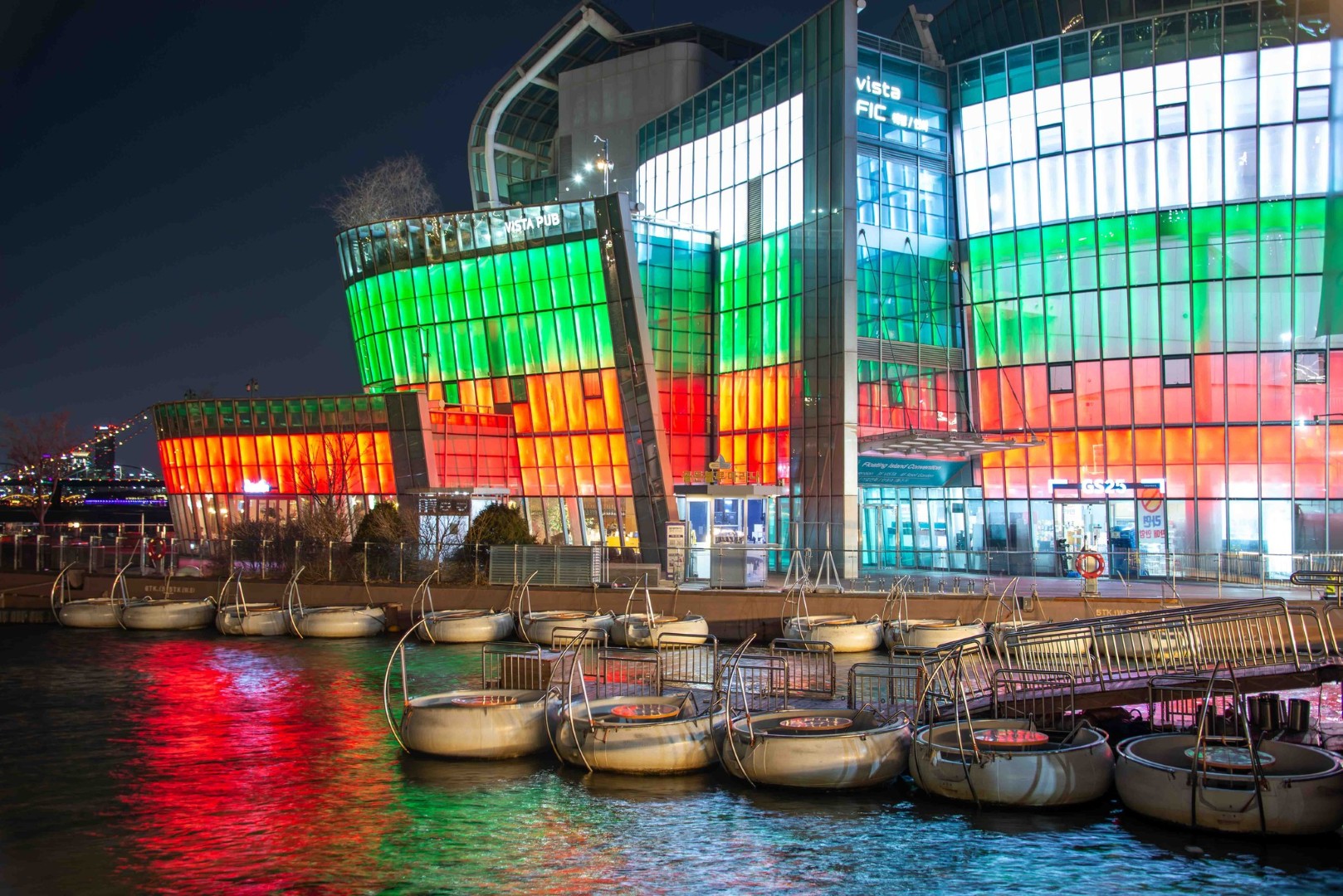 По традиция и за втора поредна година, в бяло, зелено и червено ще сияе и футуристичният комплекс от плаващи острови Some Sevit в подножието на моста Banpo на река Hangang или – както е известен в Република Корея – комплексът Sebitseom (Островите на трите светлини).