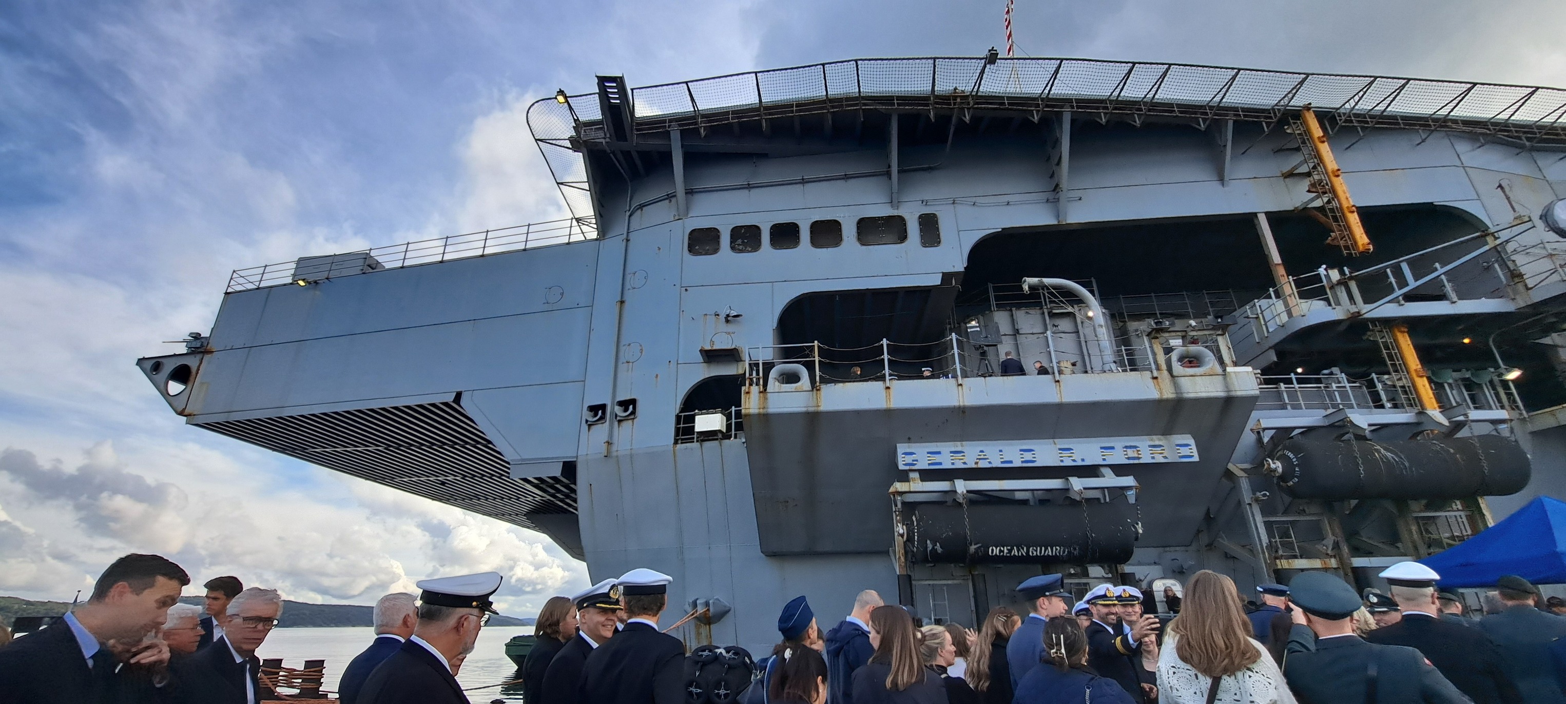 При влизането на българския посланик, в съответствие с протокола на подобна визита, бяха отдадени съответните церемониални почести от екипажа. Водещи гости на церемонията от страна на Норвегия бяха външният министър Н.П. г-н Еспен Барт Айде и главнокомандващият норвежките въоръжени сили генерал Ерик Кристоферсен. В приветственото си слово норвежкият външен министър със задоволство подчерта, че докато американският самолетоносач е във водите на Норвегия като част от задачите по гарантиране на сигурността на НАТО в Далечния север, норвежки военен кораб е на мисия в Тихия океан като част от същата съюзническа солидарност.