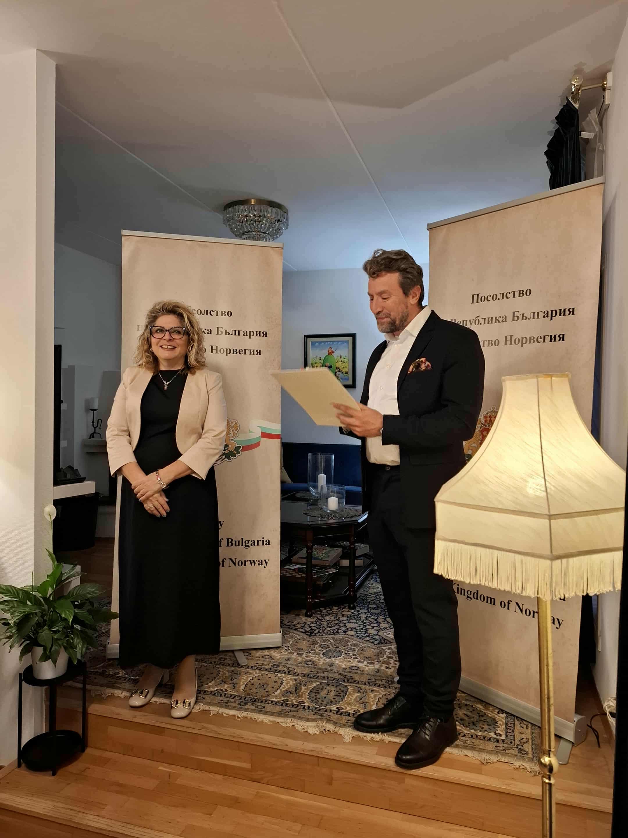 Извънредният и пълномощен посланик на Република България в Кралство Норвегия г-жа Десислава Иванова връчи на тържествена церемония в българската резиденция в Осло екзекватурата и консулския патент на първия почетен консул на Република България в Кралство Норвегия г-н Кирил Кутин.