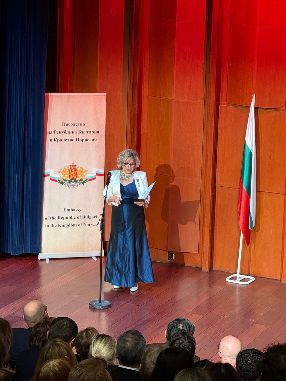 Извънредният и пълномощен посланик на Република България в Кралство Норвегия г-жа Десислава Иванова приветства на 3 март 2026 г. представителите на норвежките държавни институции и културни и бизнес среди, дипломатическия корпус, приятелите на страната ни в Норвегия и българската общност по повод Националния празник на България на организирания от Посолството тържествен комплексен ивент, посветен на празника, и целящ да промотира страната ни и българското културно-историческо наследство.