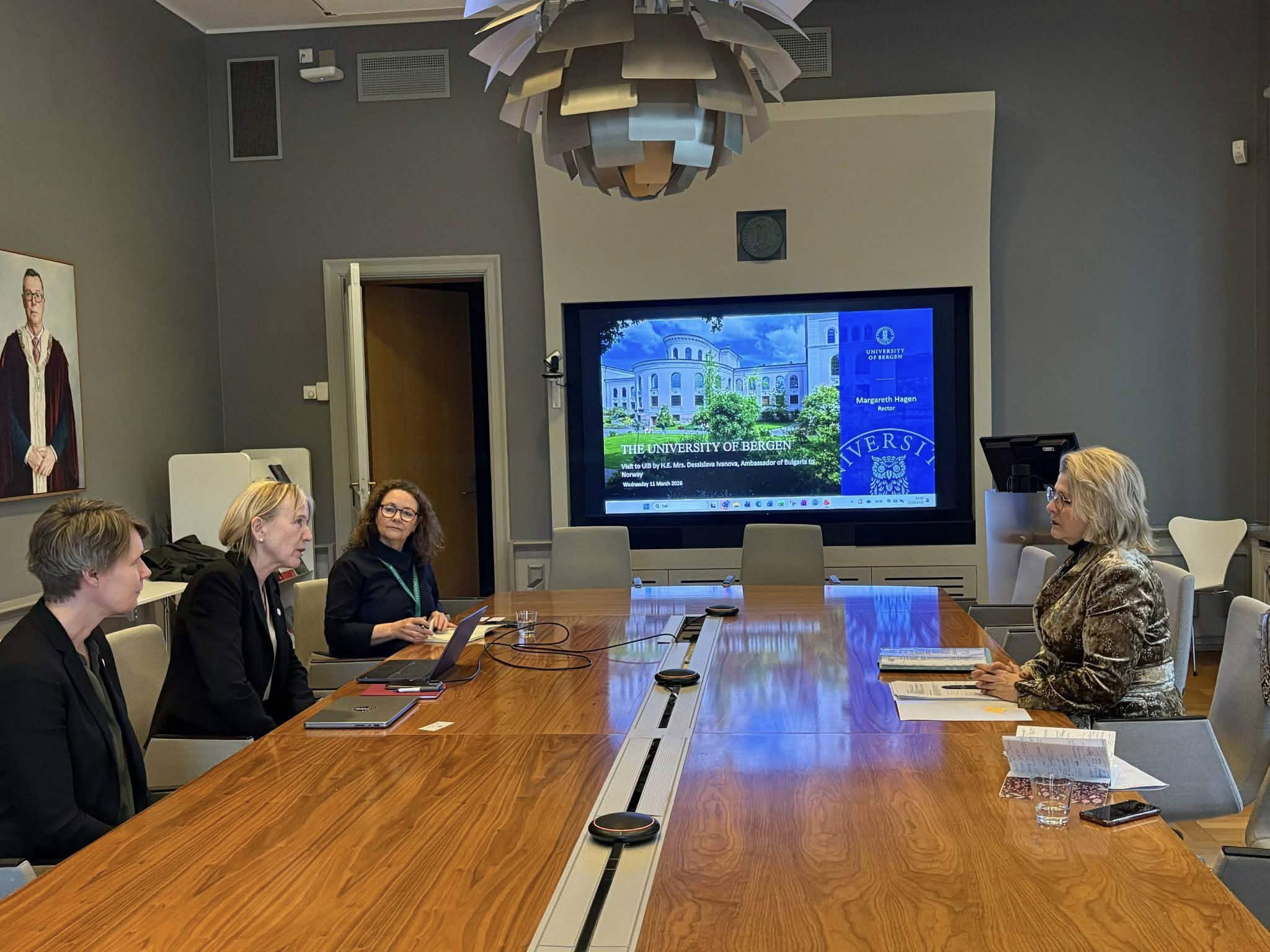 Официална среща с ректора на Университета в Берген г-жа Маргарет Хаген проведе извънредният и пълномощен посланик на Република България в Кралство Норвегия Н.Пр. г-жа Десислава Иванова. Активизиране на връзките между българските и норвежките висши учебни заведения, повишаването на познанието за България в Норвегия чрез организиране на съвместни ивенти, популяризиращи културното и историческо наследство на страната ни, бяха акцент в разговора.