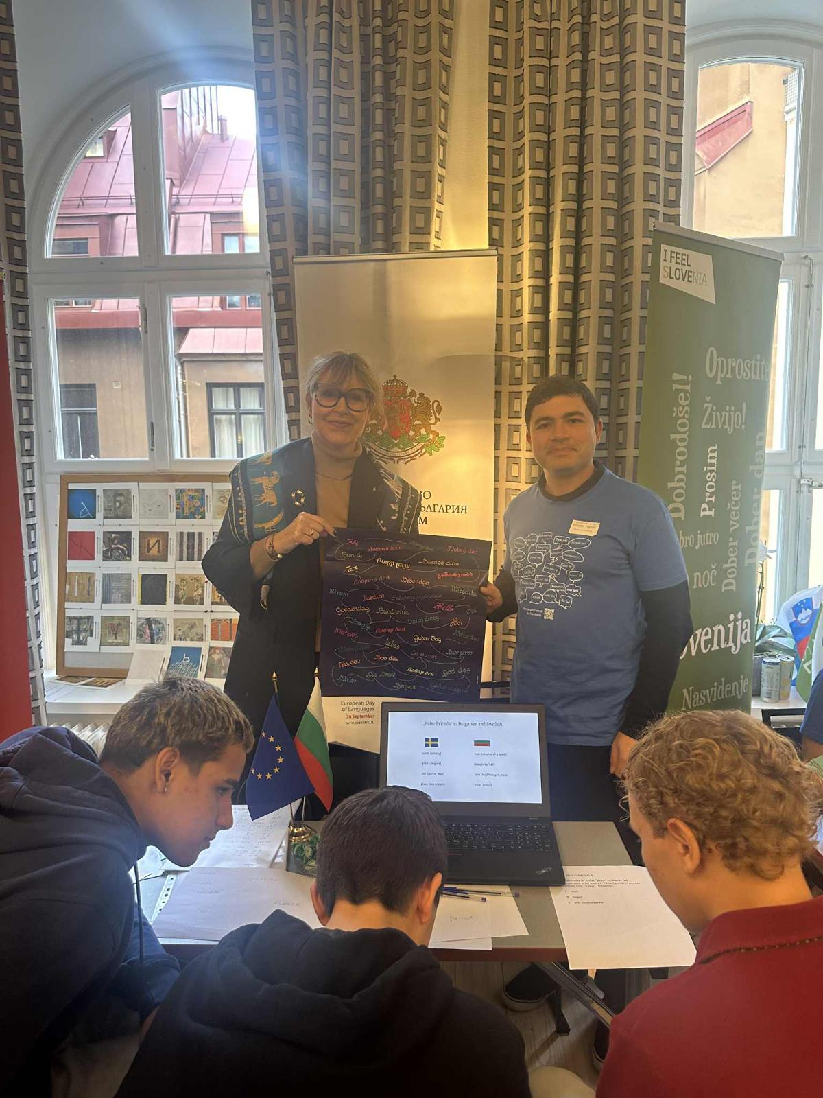 И тази година България взе успешно участие в Деня на европейските езици, организиран от представителството на ЕС в Стокхолм. Събитието се проведе на 30 септември, като българското участие бе осъществено от посолството в Стокхолм с помощта на преподавателя по български език и литература Любима Рафаилова от българското неделно училище в шведската столица. Благодарим за оказаната подкрепа и изразеното желание за участие във форума!