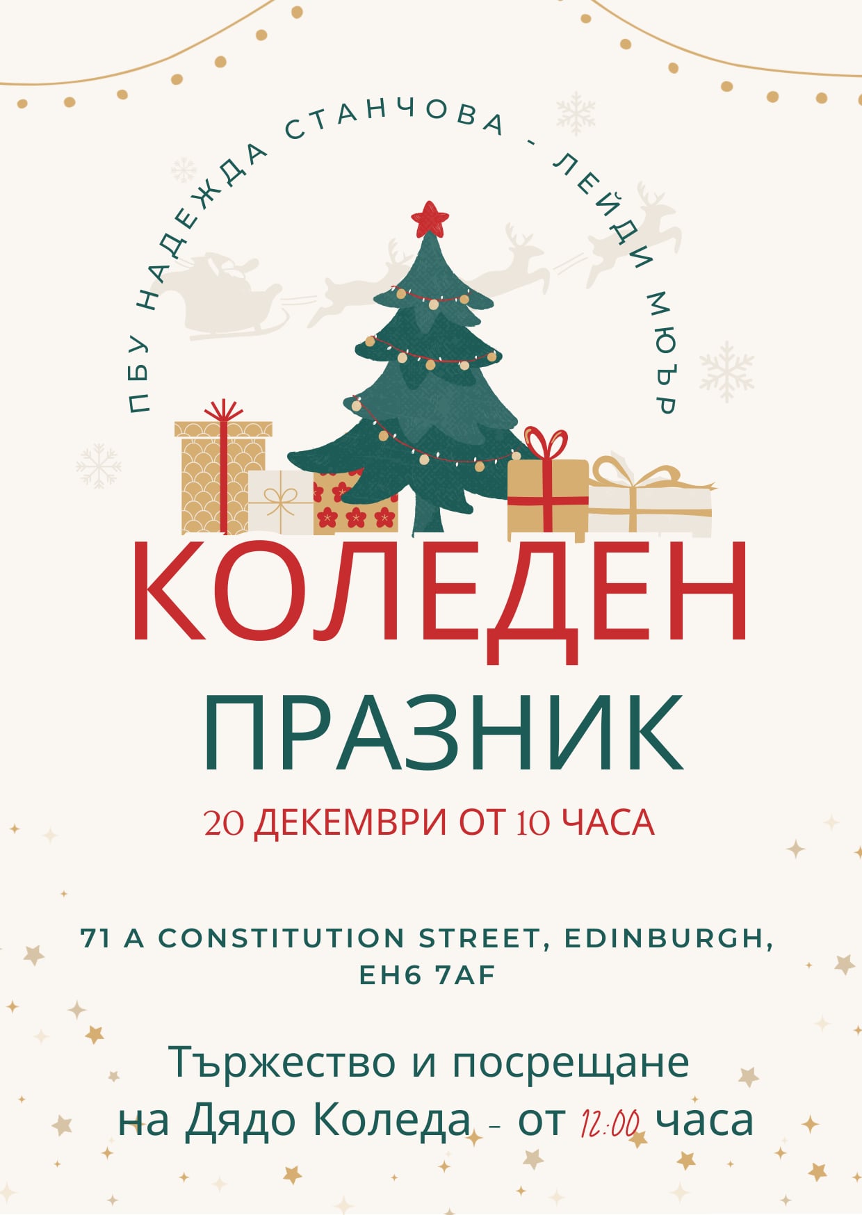 На 20 декември в „Първо българско училище „Надежда Станчова – лейди Мюър“ в Единбург се проведе вълшебен коледен празник, който събра деца, родители и гости в празнична атмосфера. Част от събитието стана и Консулството на Република България в Единбург, което сподели радостта от празника с училищната общност.
