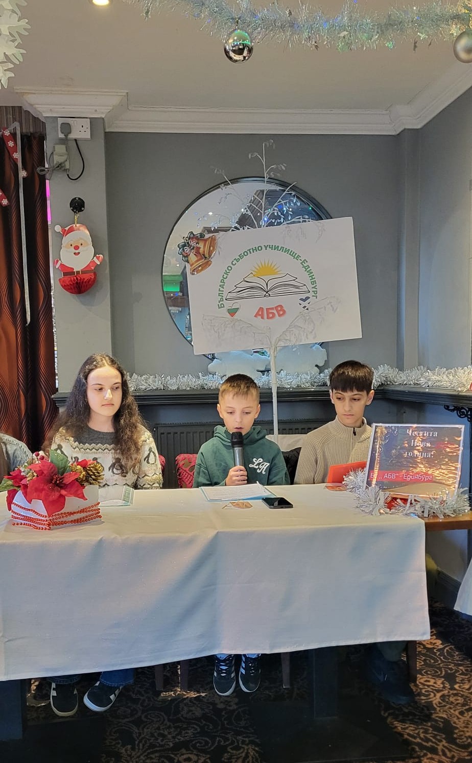 И на Коледното тържество на „Българско съботно училище "АБВ" дойде дядо Коледа, придружаван от Снежанка. Двамата и гостите се насладиха на представлението, което бяха подготвили учениците. Преподавателите с вещина ръководиха празника, а снимките и видеата от родителите съпътстваха тържеството. Малчуганите с трепет отваряха подаръците, донесени от дядо Коледа и Снежанка. Всички искаха да се снимат с двамата почетни гости, които се радваха на проявеното към тях внимание. Поздравителен адрес имаше от Консулството в Единбург, с което сътрудничеството на училището е факт от откриването на дипломатическата мисия.