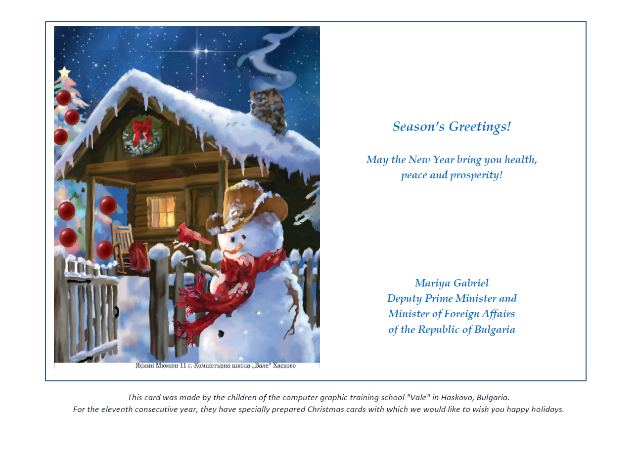 Greeting card from the Deputy Prime Minister and Minister of Foreign Affairs Maria Gabriel on the occasion of the Christmas and New Year holidays