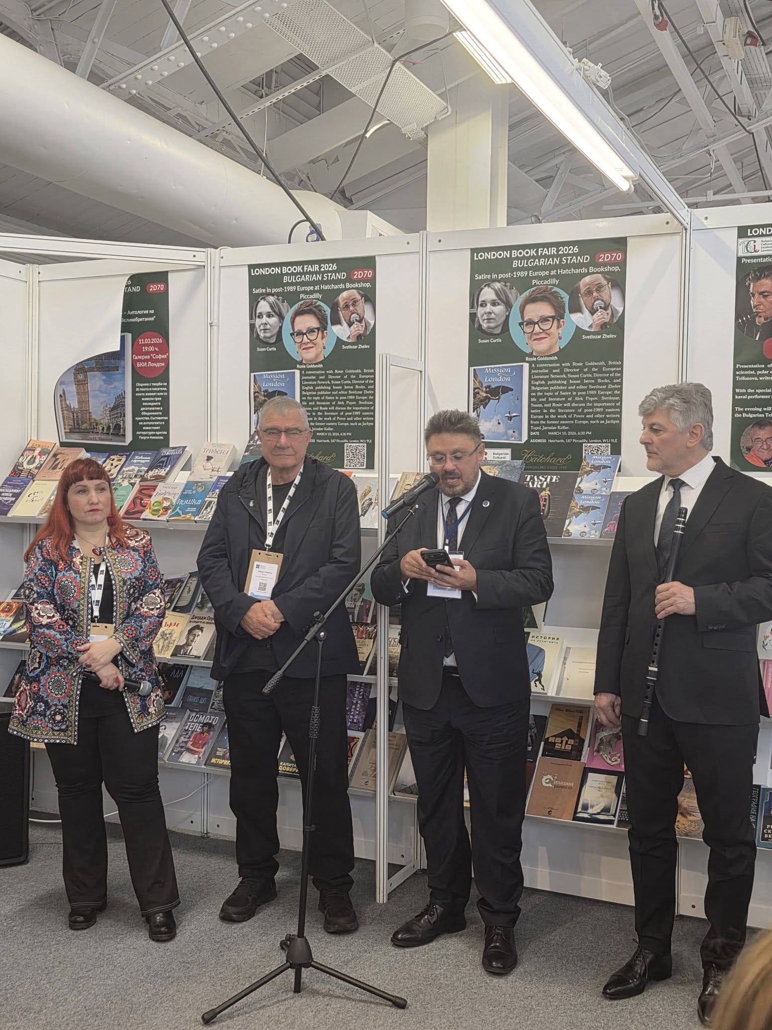 A discussion titled Satire in Post-1989 Europe was held at the Hatchards Bookshop, featuring Rosie Goldsmith, Director of the European Literature Network, Susan Curtis, Director of Istros Books, and the Bulgarian publisher and editor Svetlozar Zhelev.