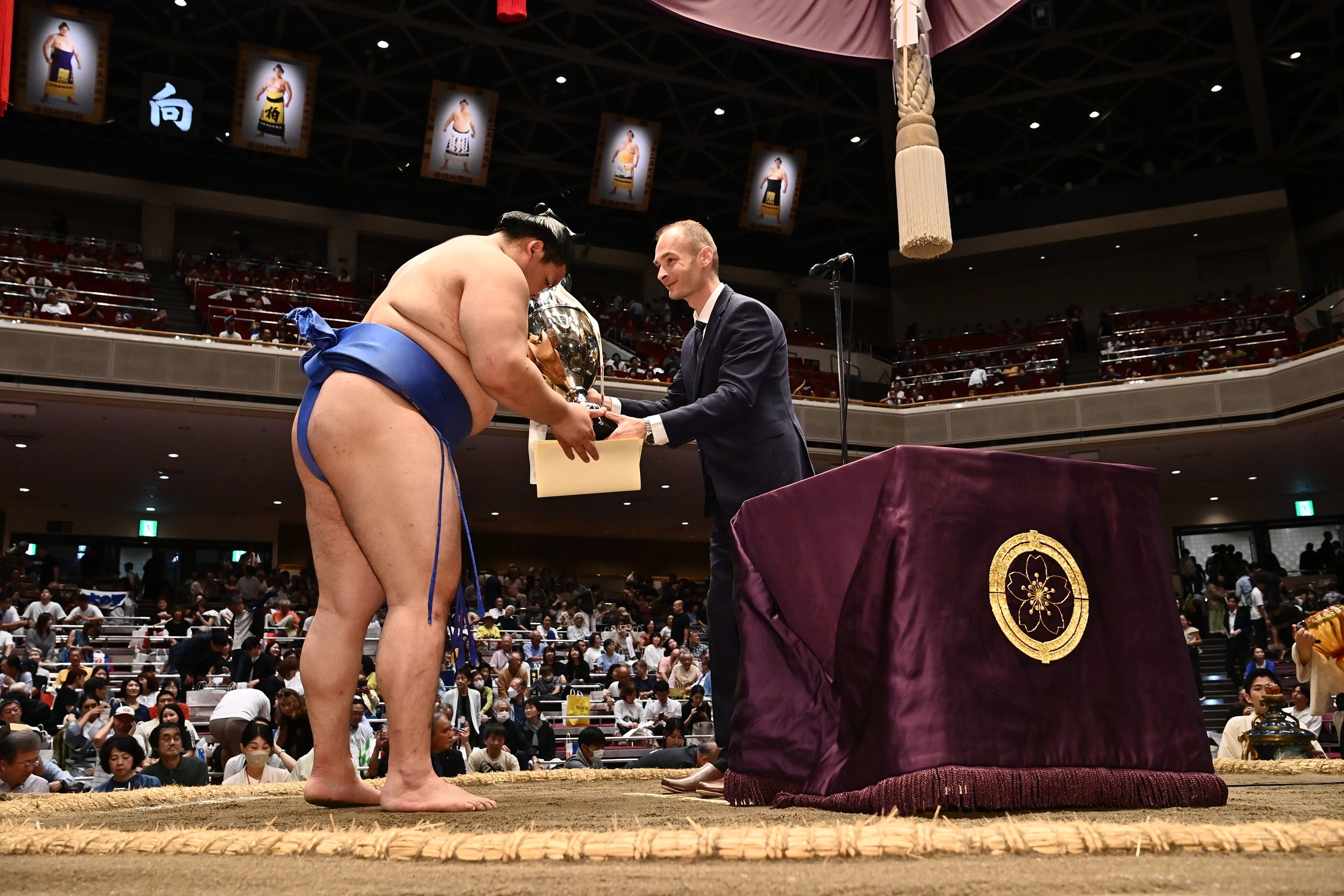 大相撲令和7年9月場所において、駐日ブルガリア共和国大使館一等書記官、ペタル・ニコラエフ氏がマリエタ・アラバジエヴァ大使代理として、優勝力士 大の里 にブルガリア共和国政府より表彰状と優勝杯を授与しました。副賞としてブルガリアのワインも贈呈されました。